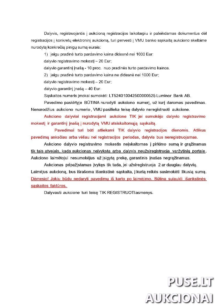 Objekto apžiūra galimas Žemaitės al. 10, Kretinga. Visos kainos nurodytos su PVM. Pirkėjas privalo sumokėti 20 EUR registracijos mokestį ir 40 EUR garantinį mokestį, nes pradinė turto kaina neviršija 1000 Eur. Garantinis įnašas yra negrąžinamas, jei laimėtojas nesumoka už įsigytą prekę. Registracijos mokestis grąžinamas tik tuo atveju, jeigu aukcionas neįvyksta arba dalyvis nespėja užsiregistruoti portale.