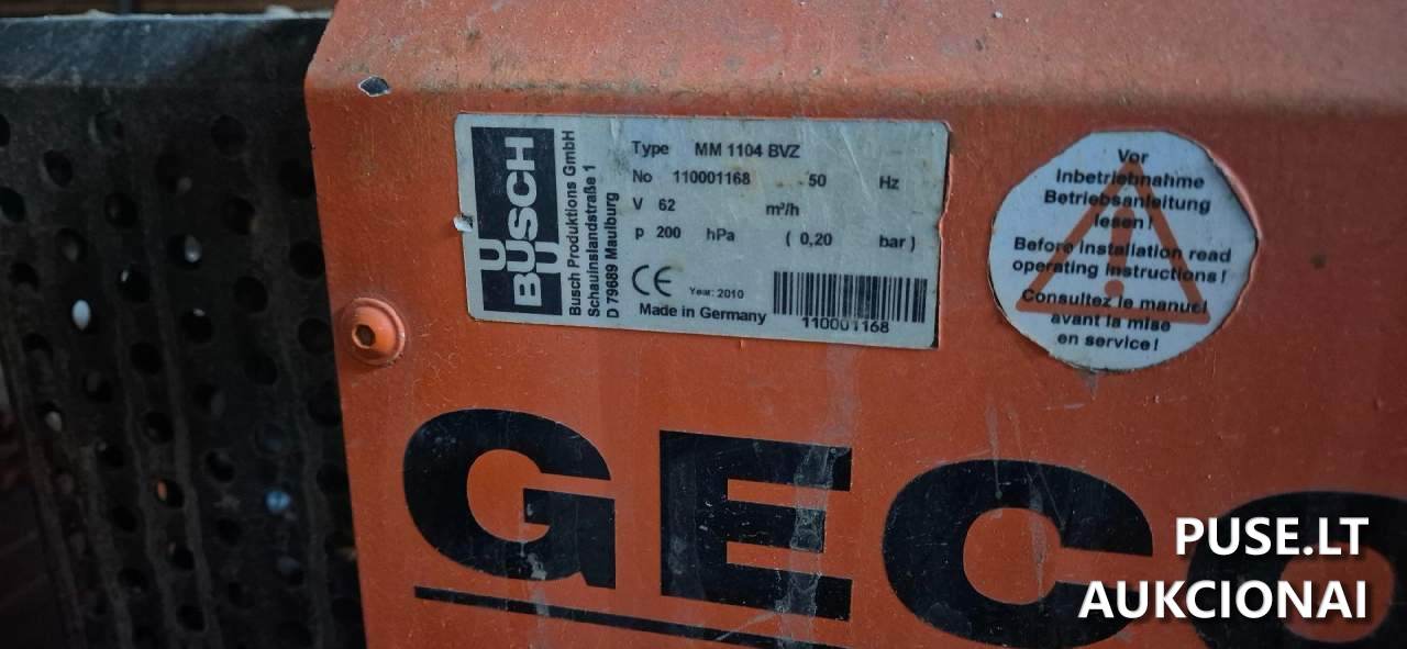 Parduodamas pramoninis įrenginys - vakuminis siurblys GECO Power MM 1104 BVZ - vykstančių nemokumo administratorių varžytynių būdu. Šis drenažinis siurblys, tinkamas techninei įrangai priskiriamas, turi 62 m3/h pajėgumą. Įsigijimo metai yra 2011 m., o šiuo metu nurodoma, kad siurblio būklė yra gera, įrenginys parduodamas su pilnu komplektu. Pradinė kaina nustatyta 12750 EUR. Parduodamas objektas yra PVM objektas. Pirkimas vyksta viešame aukcione, kurio statusas yra "Vykstančios".