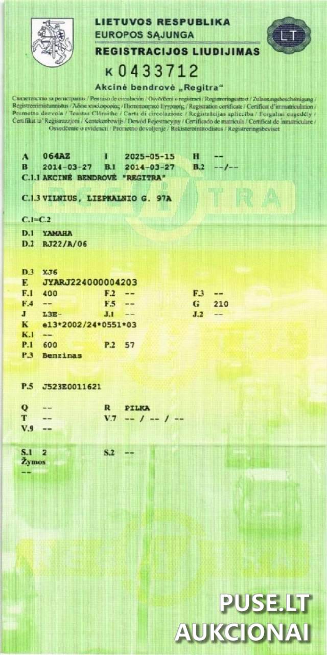 Parduodamas 2014 metų Yamaha XJ6 motociklas, siūlomas per pirminį viešąjį AB "Regitra" aukcioną. Motociklo identifikavimo numeris yra JYARJ224000004203, o registracijos numeris – nurodomas kaip 064AZ Juridinis registracijos Nr. 064AZ. Motociklo rida siekia 57760 kilometrų. Galima apžiūra Kaune, Raudondvario pl. 234B vietoje.