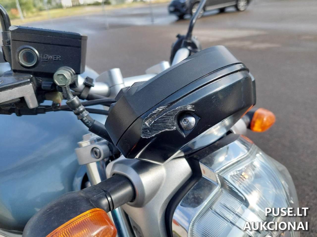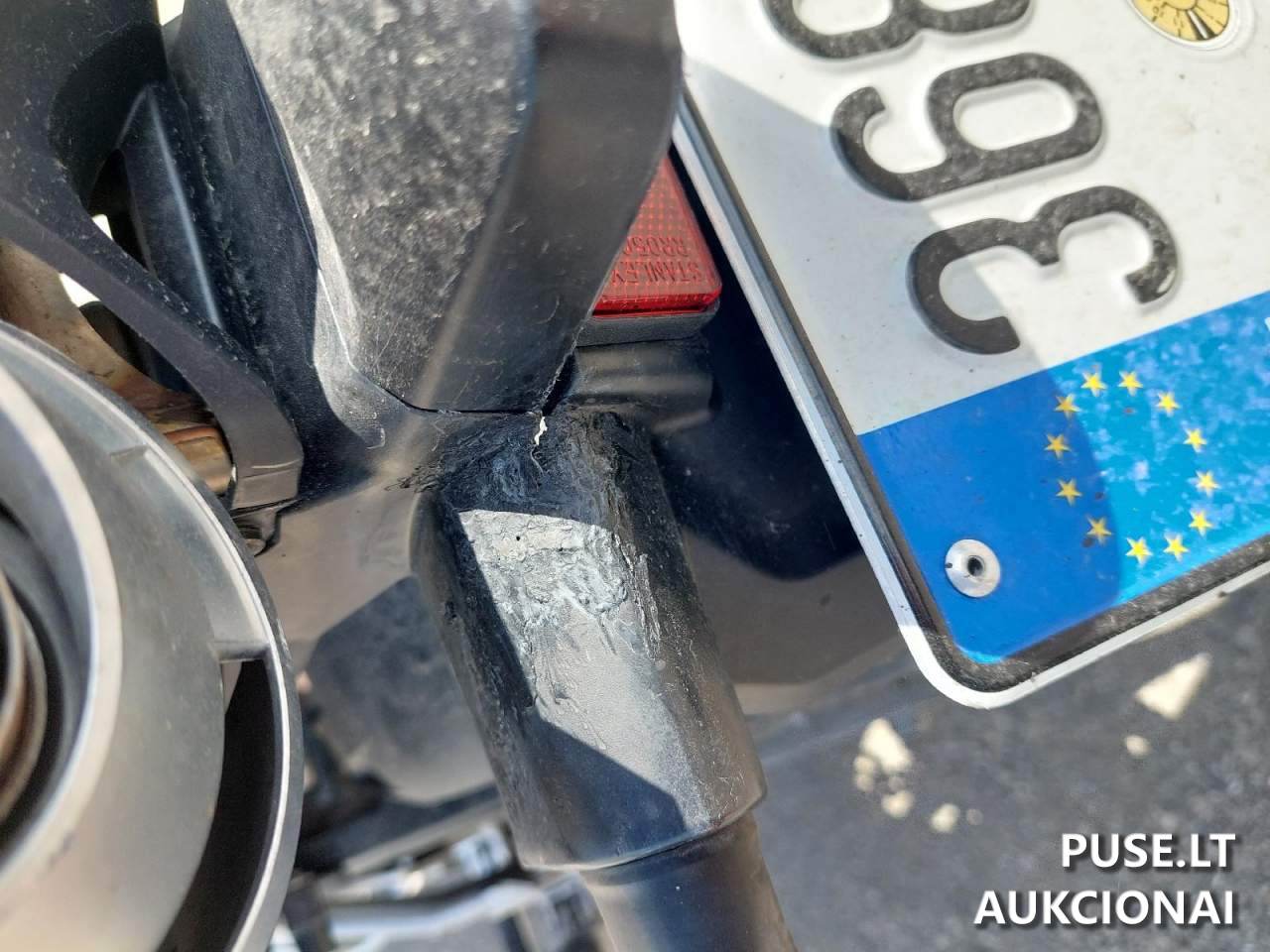 Motociklui nurodyti defektai: nubrozdinti abu šonai, žibintas, spidometras, įlenktas kuro bakas, stringa krovimo relė ir nulaužtas pakojis.
