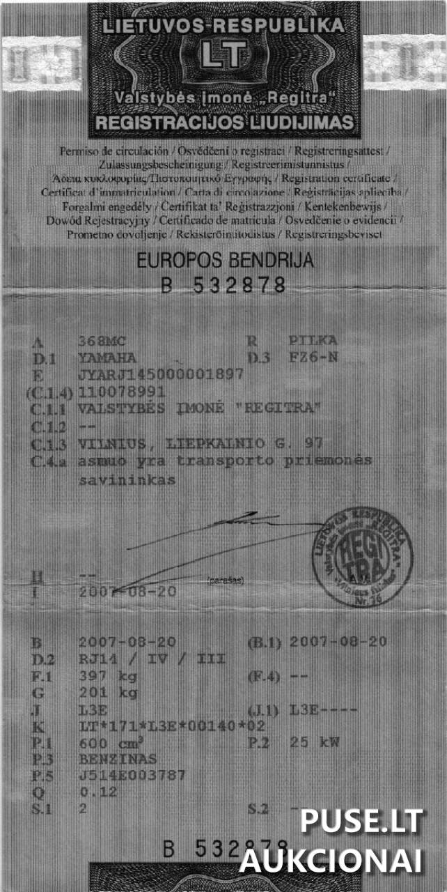 Parduodamas motociklas Yamaha FZ6-N, 2007 metų gamybos, siūlomas viešame aukcione. Pradinė šio motociklo kaina siekia 1900 EUR. Motociklo identifikavimo numeris yra JYARJ145000001897, o jo bendra rida yra 19383 km. Juridiniai duomenys nurodyti naudojant 368MC, o transporto priemonės registracijos liudijimo Nr. yra K0433100.