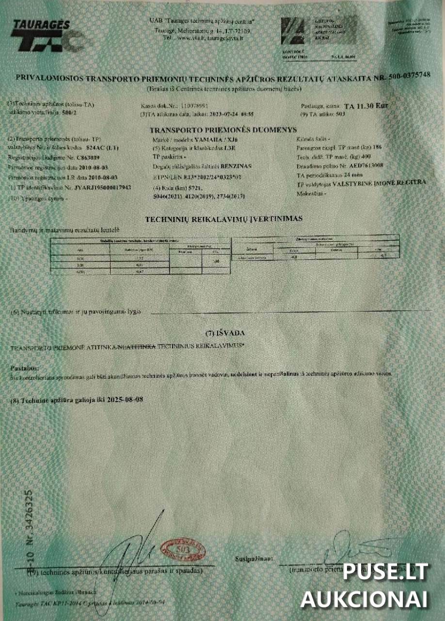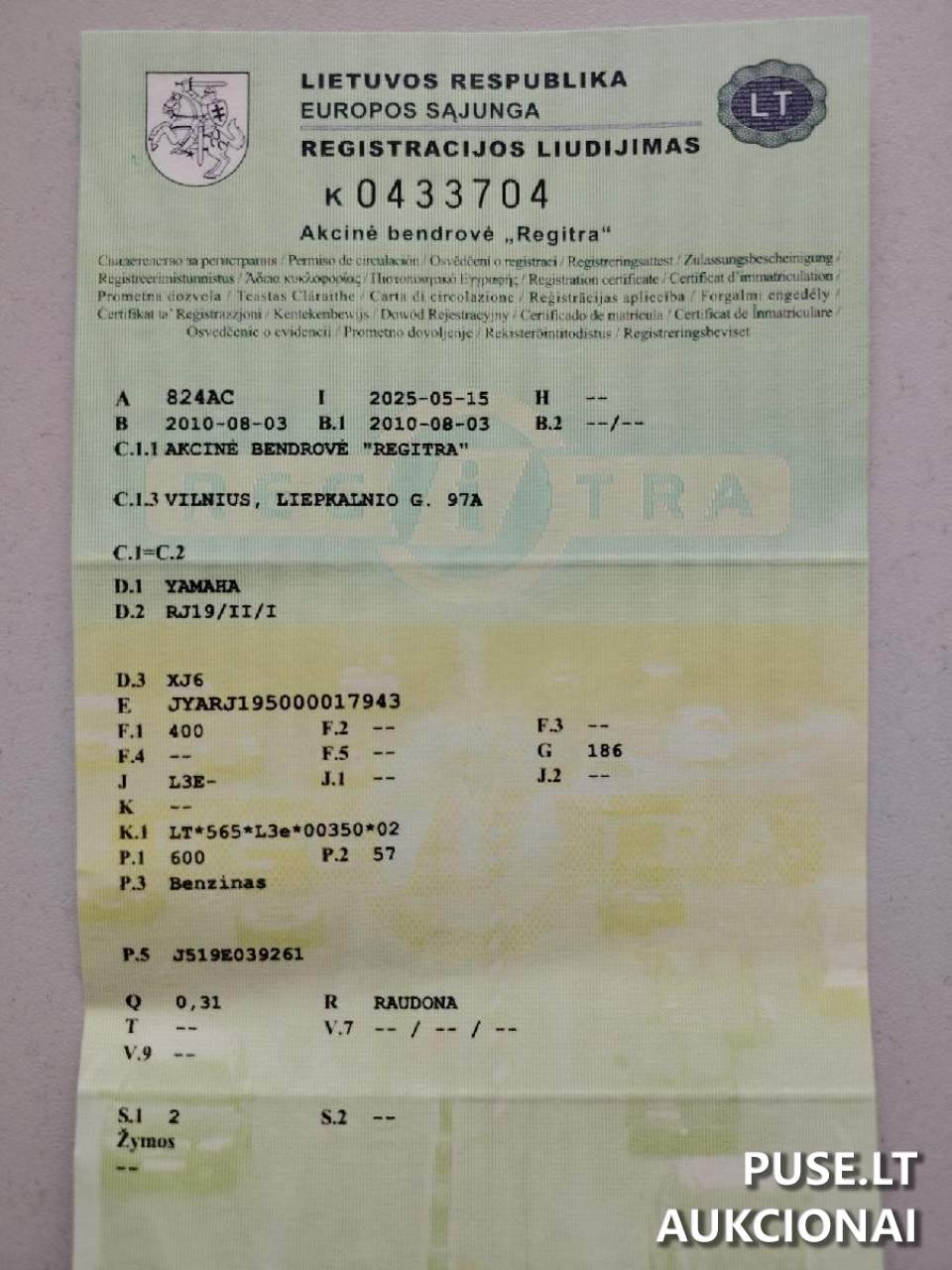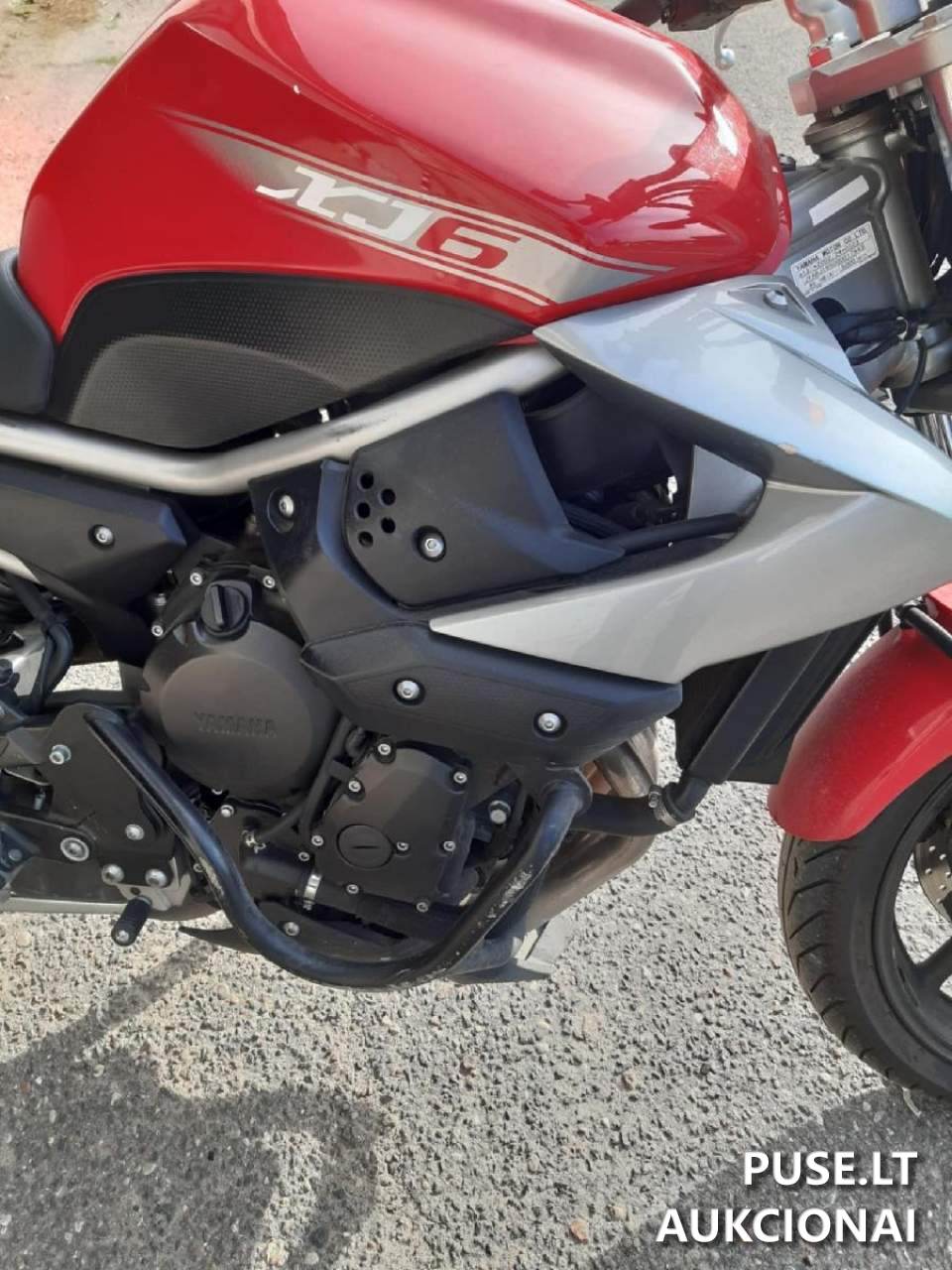 Parduodamas 2010 metų Yamaha XJ6 motociklas viešame aukcione, kurio pradinė kaina nustatyta 3000 EUR. Šis motociklas yra paskelbtas Kituose aukcionuose, identifikavimo numeris JYARJ195000017943, motociklo rida siekia 6716 km. Bendra transporto priemonės registracijos numerio grupė yra 824AC.