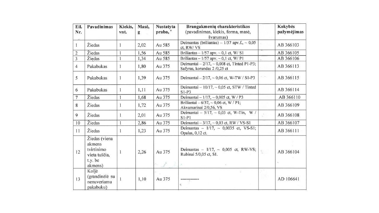 Parduodama unikali galimybė įsigyti 13 vnt. prabangių juvelyrinių dirbinių pakartotiniame aukcione, kurio pradinė kaina prasideda nuo 1452 EUR. Detali juvelyrinių dirbinių specifikacija ir lydinių ekspertizės duomenys pateikti atskiroje lentelėje, atlikta VŠĮ "Lietuvos prabavimo rūmai".