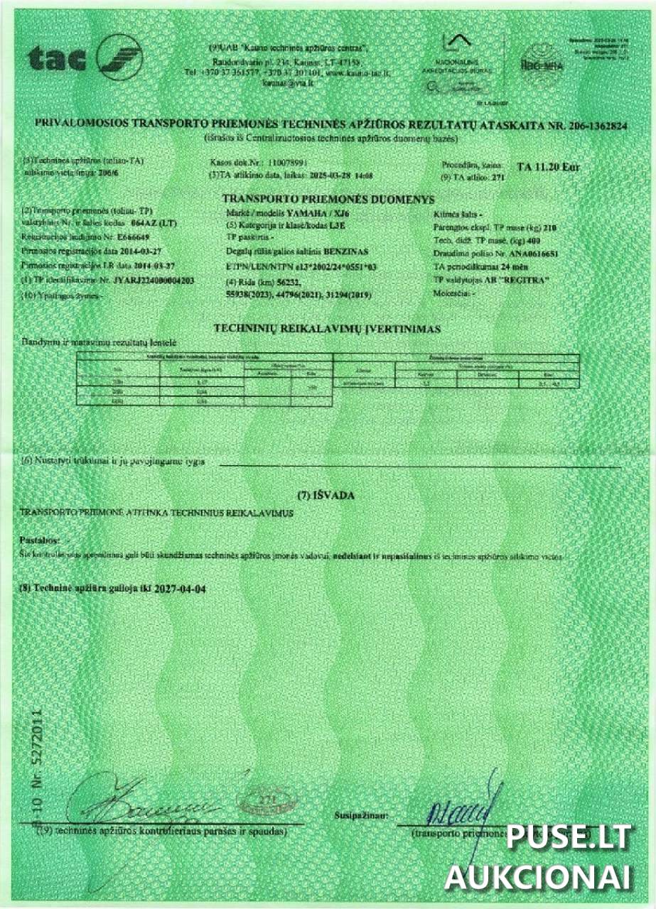 Parduodamas naudotas 2014 metų Yamaha XJ6 motociklas viešame aukcione. Pradinė pardavimo kaina yra 1953 EUR, o privalomas garantinis mokestis sudaro 195 EUR. Aukcionas, paskelbtas AB "Regitra" organizuojamas kaip kiti pakartotiniai aukcionai. Motociklas turi įvertintus defektus, įskaitant apsaugų įbrėžimus, skilinėjimus bei rėmo įbrėžimus. Bendra rida yra 57760 km. Pirkėjams primenama, kad turtas parduodamas esamos būklės ir pirkėjas prisiima visą riziką, susijusią su neapžiūrėjus ir defektų turėjimu.