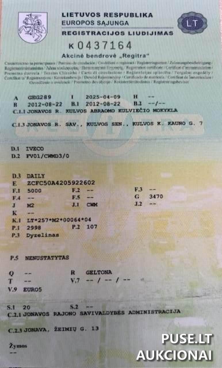 Parduodamas naudotas M2-CWM klasės keleivinis autobusas IVECO DAILY 2012 metų gamybos, siūlomas aukcione su 3700 EUR pradine kaina. Ši transporto priemonė (kategorija/klasė M2-CWM) varoma dyzeliniu varikliu, kurio darbinis tūris yra 2998 cm3, o galia siekia 107 kW. Autobuso identifikavimo numeris yra ZCFC50A4205922602 (valstybinis Nr. nebegalioja - originaliai nurodytas GEG289), jis talpina 20 sėdimų vietų, įskaitant vairuotojo vietą. Rida siekia 368667 km.