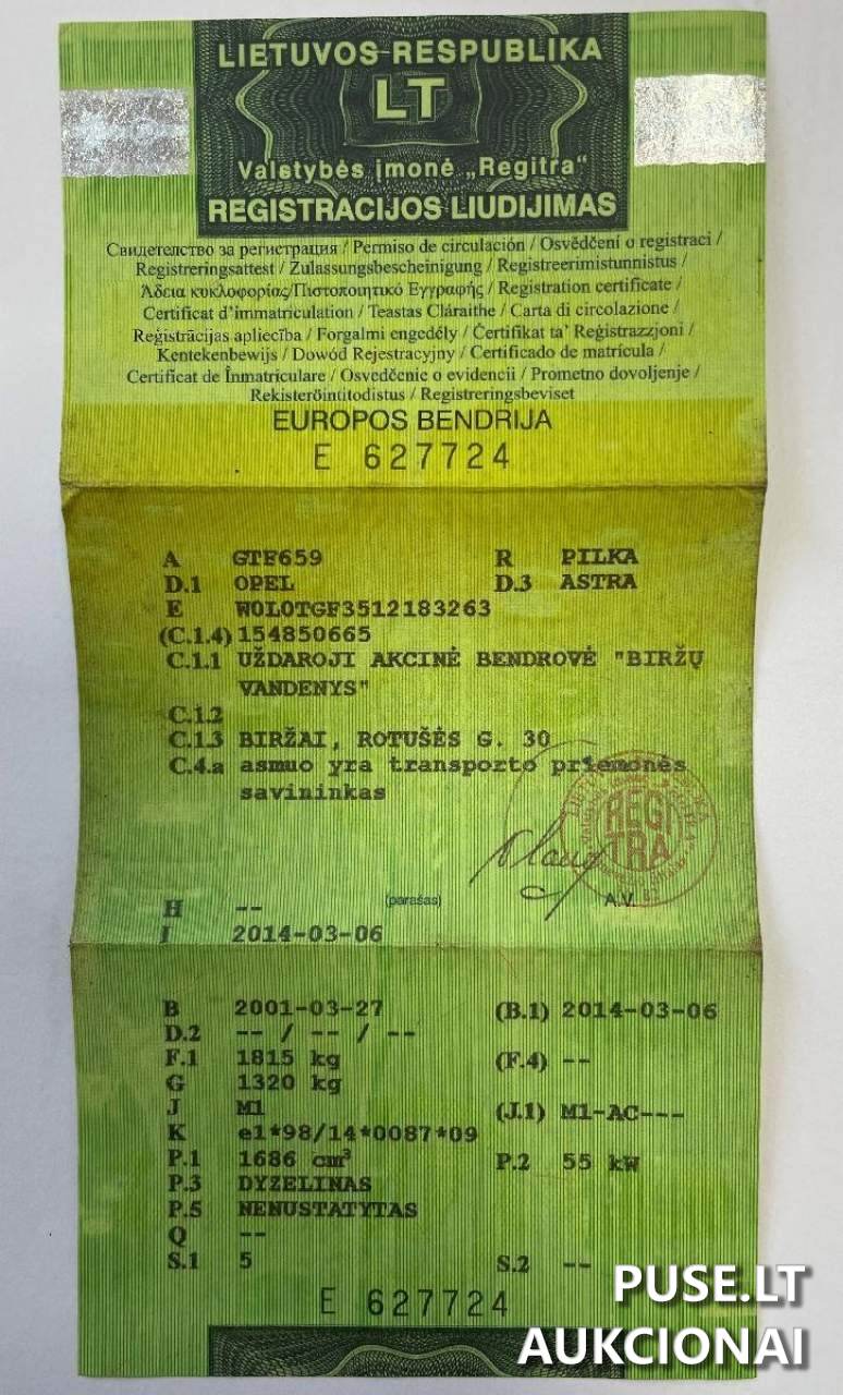 Opel Astra aukcionas Biržuose - dyzelinas 2001 m., pradinė kaina 150 EUR