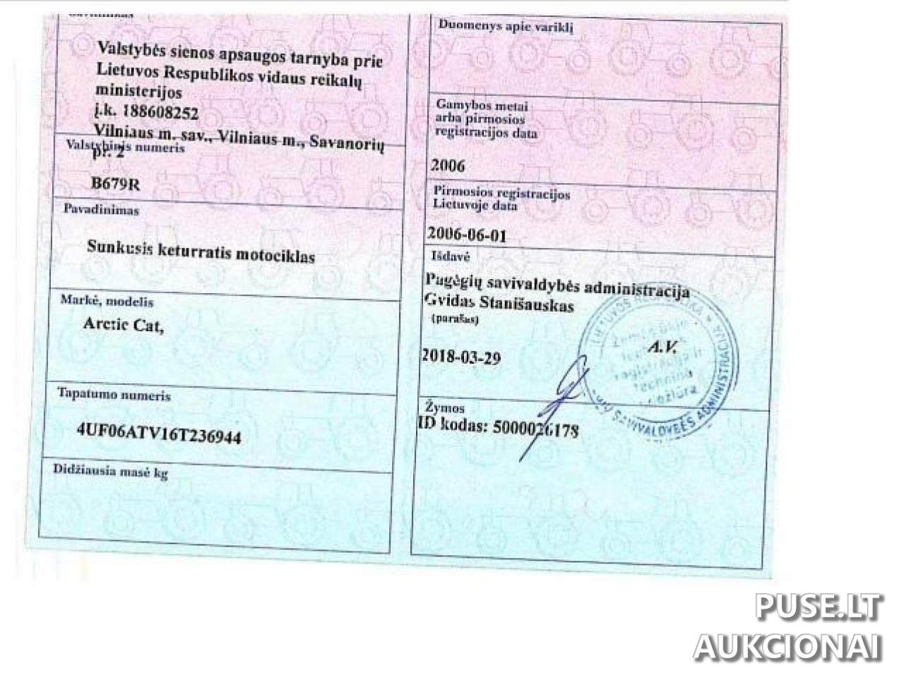 Parduodamas keturratis Arctic Cat 500TRV, pagaminimo metai 2006, kuro tipas: benzinas. Pradinė kaina 500 EUR. Garantinis įnašas 400 EUR, registracijos mokestis 10 EUR. Visi mokesčiai mokami į sąskaitą LT344040063610001097, gavėjas Valstybės sienos apsaugos tarnyba prie LR VRM. Mokėjimo paskirtyje būtina nurodyti aukciono skelbimo numerį (ID 74867). Garantinis įnašas įskaičiuojamas į laimėto turto kainą; likusi suma turi būti pervesta per 3 darbo dienas. Garantinis įnašas grąžinamas per 10 darbo dienų nuo elektroninio aukciono pabaigos; registracijos mokestis nėra grąžinamas. Po apmokėjimo aukciono laimėtojas per 3 darbo dienas pasirašo turto priėmimo–perdavimo aktą; nepasirodžius arba nepasirašius dėl laimėtojo kaltės organizatorius išlaiko teisę nelaikyti garantinio įnašo ir reikalauti kompensacijų pagal Lietuvos Respublikos civilinio kodekso nuostatas. Turto pardavimas vykdomas be garantijos, turtas negrąžinamas. Turto būklę pirkėjas įsivertina apžiūros metu.