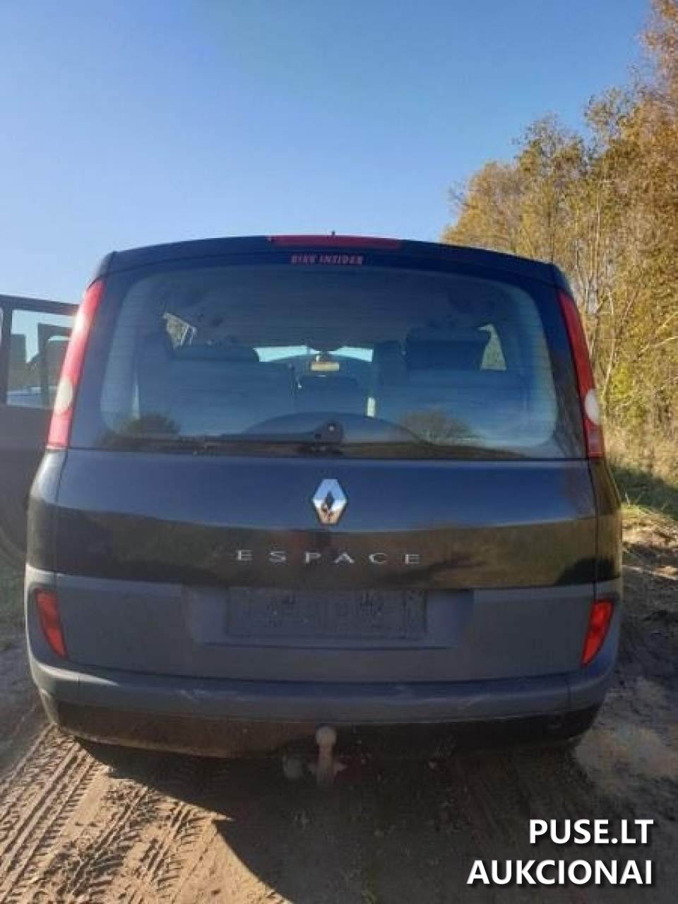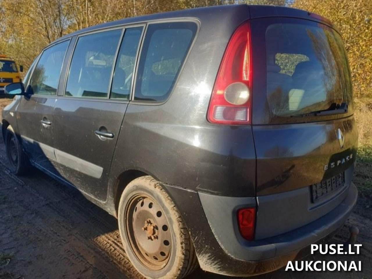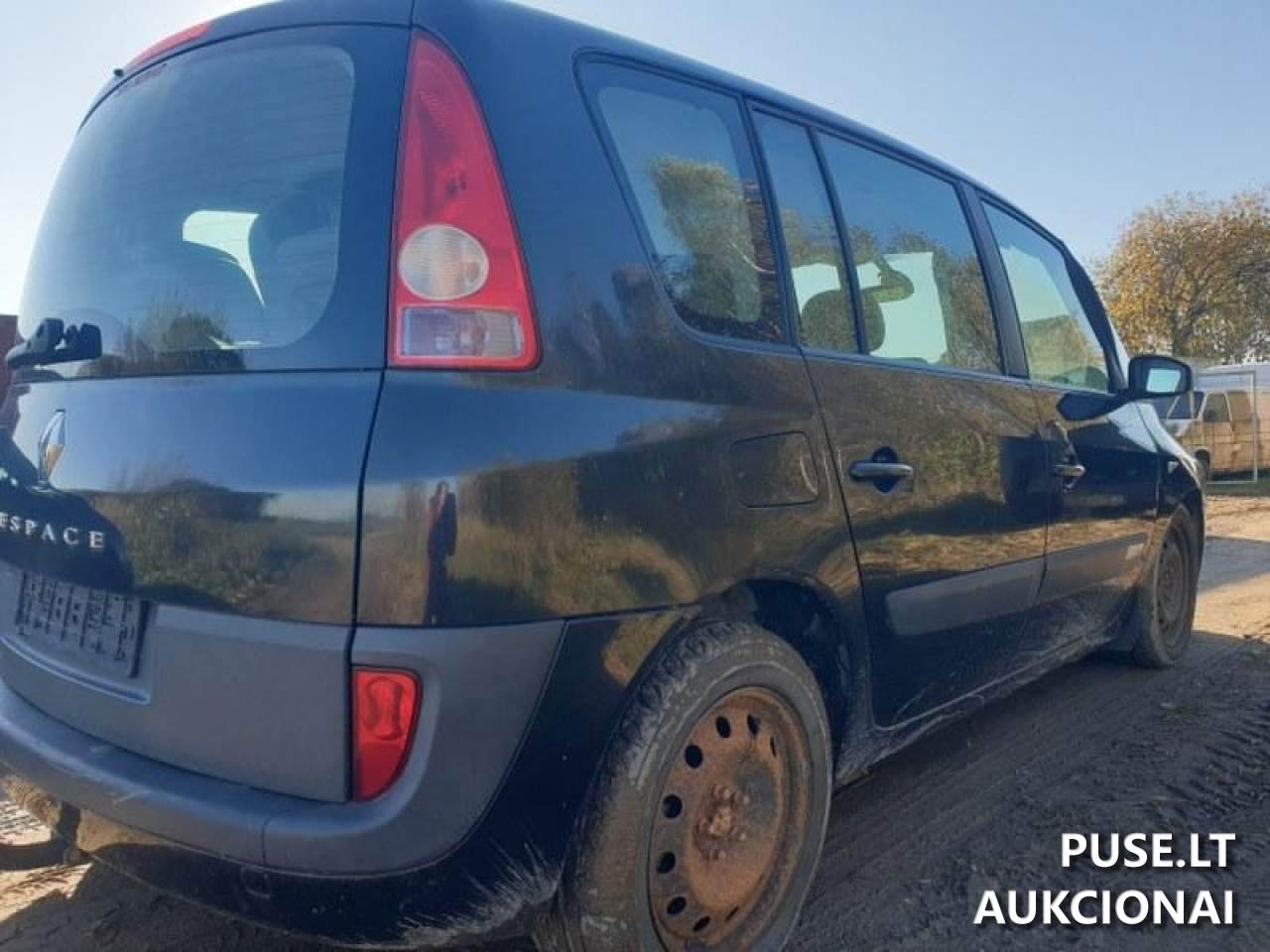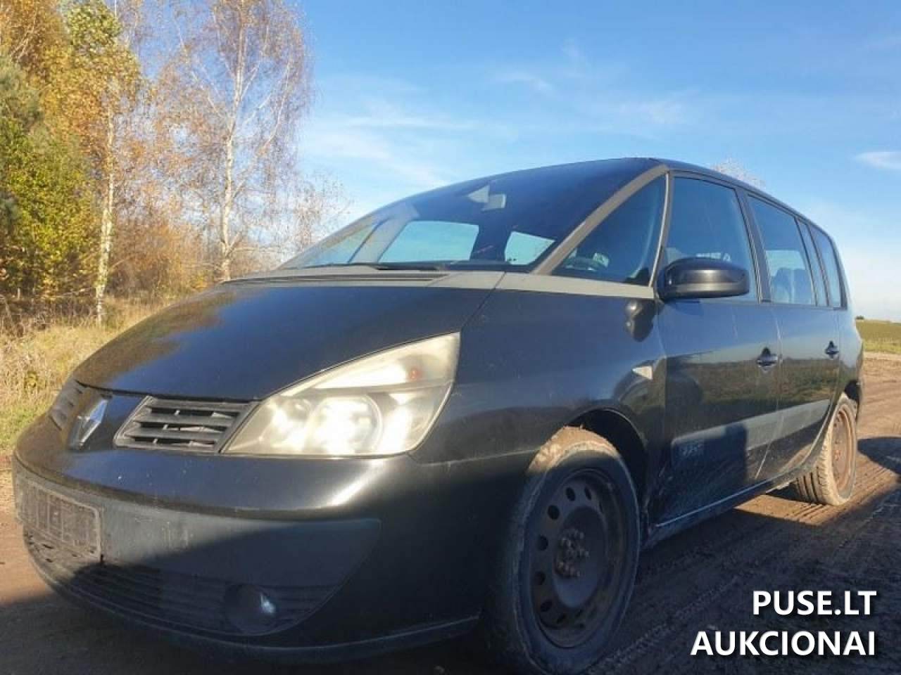 Renault Espace (gamybos metai 2004-01). Dyzelinas, darbinis tūris 2188 cm3, galia 110 kW, rida 211243 km, keleivinis, 7 sėdimos vietos. Techninė apžiūra (T.A.) nebegalioja. Pastebėti defektai: silpnas akumuliatorius, įbrėžimai, palankstymai, skysčių prasiskverbimas, rankinio stabdžio gedimas, stiklo ir kiti fiziniai pažeidimai. Techninė būklė ir nusidėvėjimas nustatomi apžiūros metu; po aukciono pretenzijos dėl techninės būklės nepriimamos.
