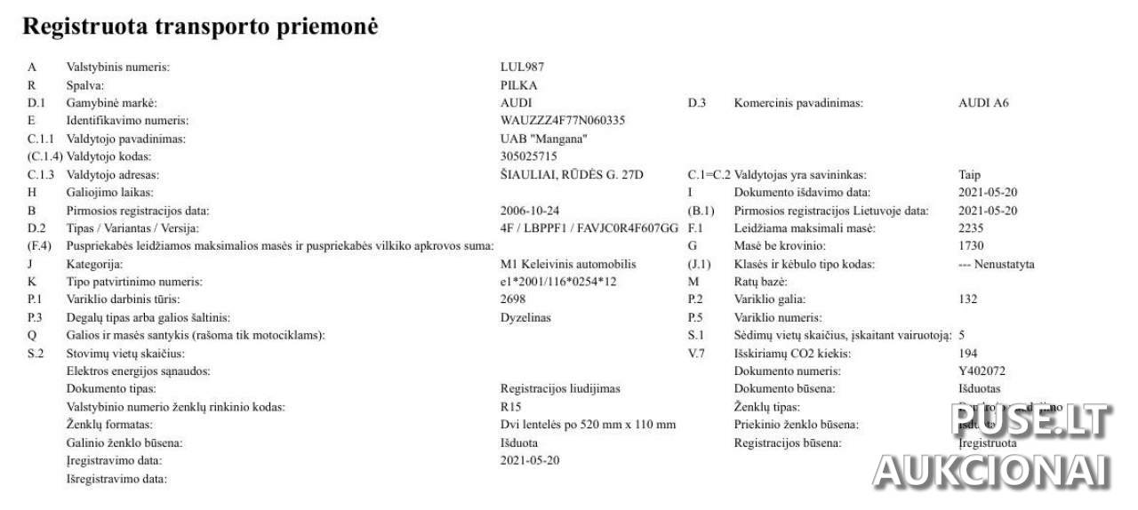 Automobilis AUDI A6, 2006 m., variklis 2698 cm3, dyzelinas, rida daugiau nei 332000 km. Transporto priemonė parduodama priverstinai vykdant varžytines. Transporto priemonės būklė nustatoma apžiūros metu vietoje iki varžytynių pabaigos. Varžytynių vykdytojas neteikia jokio garantinio ar būklės patvirtinimo dėl parduodamo turto vertės, atitikimo teisės aktams ar tinkamumo naudoti konkrečiai paskirčiai. Pagal varžytynių tvarką, varžytynių aktas surašomas ir turto nuosavybė pirkėjui perduodama ne anksčiau kaip po 20 dienų nuo varžytynių pabaigos. PVM objektas: Ne.