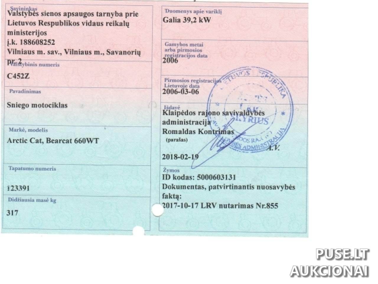 Parduodamas 2006 metų benzininis sniegomobilis Arctic Cat WT 660 aukcione startine kaina 1000 EUR. Šis transportas yra klasifikuojamas kaip Sniegaeigis kitų aukcionų kategorijoje. Tai puiki galimybė įsigyti specifinę transporto priemonę. Būklę pirkėjas turi įvertinti savarankiškai turto apžiūros metu, nes organizatorius už įsigyto turto kokybę neatsako ir pretenzijų nepriima.