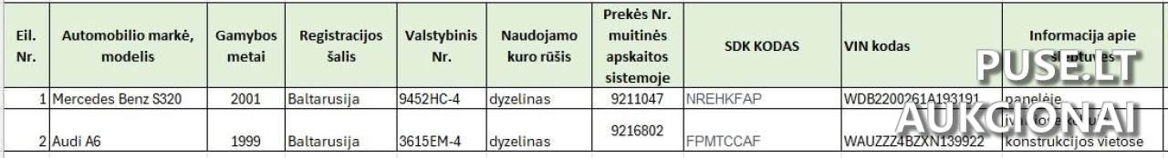 Paskelbtas kitiems aukcionams priskiriamas dviejų transporto priemonių pardavimas: Mercedes Benz S320 ir Audi A6 942. Pradinė šių transporto priemonių kaina nustatyta 1243 EUR. Būtina sumokėti 1000 EUR garantinį mokestį bei 10 EUR registracijos mokestį, norint tapti aukciono dalyviu.