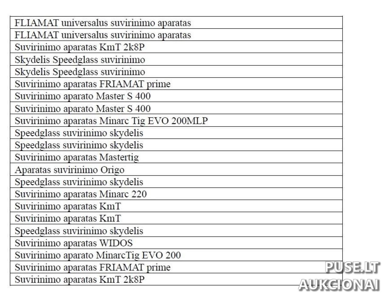 Parduodamas suvirinimo įrangos kompleksas, kurį sudaro suvirinimo aparatai ir suvirinimo skydeliai, kaip vienas turtinis vienetas per pakartotinį aukcioną. Šis parduodamas turtas yra PVM objektas. Buvęs BUAB "Šiaulių dujotiekio statyba" priklausęs turtas siūlomas viešame, atvirame aukcione. Būtina susipažinti su išsamiu suvirinimo įrangos sąrašu, kuris yra pateikiamas atskirai.