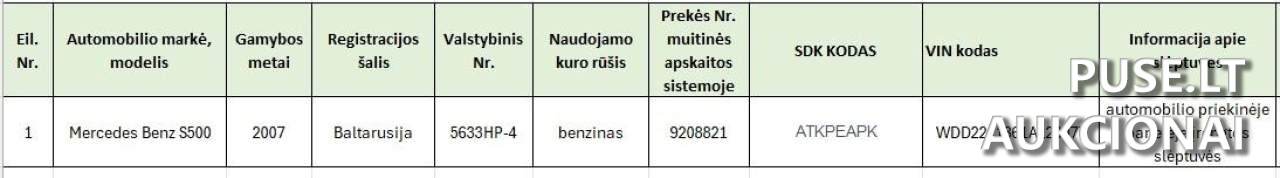Kokia yra pradinė Mercedes Benz S500 kaina ir kada baigiasi aukcionas?