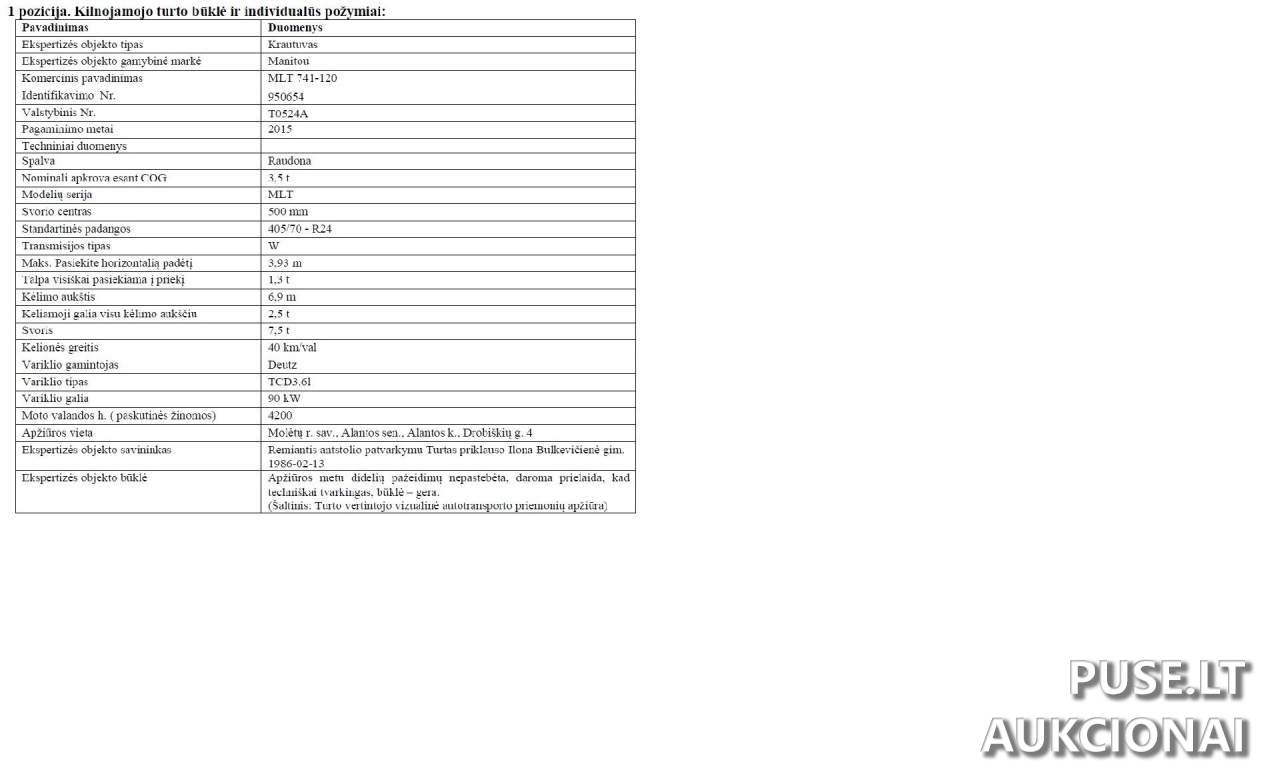 Parduodamas iš antrųjų rankų krautuvas Manitou MLT 741-120, klasifikuojamas kaip traktorius, savaeigė mašina, priekaba arba puspriekabė, parduodamas vykdant antstolių varžytynes. Ši mašina parduodama su pradine 29648 EUR kaina. Aukcionas vyksta internetu ir yra aktyvus. Unikalus objekto identifikacinis numeris registre yra 950654. Pardavimo procesą administruoja Antstolis Sigitas Osvaldas Grašys, atstovaujamas Antstolio S.O.Grašio kontoros, esančios Zarasuose. Prieš įsigyjant, svarbu atkreipti dėmesį į tai, kad šiam turtui galioja Hipotekos nutartis, kuri gali apriboti nuosavybės teises ar perleidimą. Daugiau informacijos apie galimas naudojimo sąlygas teirautis pas organizatorių. Būklė ir techniniai duomenys turėtų būti patikslinti apžiūros metu.