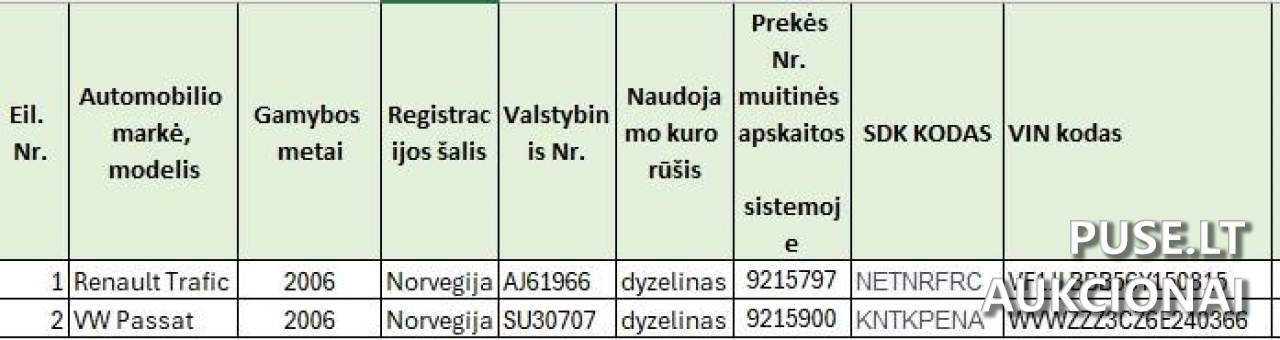 Parduodamos dvi naudotos transporto priemonės - Renault Trafic ir VW Passat - pakartotiniame aukcione, kurio pradinė kaina yra 1376 EUR. Šis pardavimas vykdomas vykdant teismo sprendimus, todėl taikomos specifinės pardavimo ir kokybės garantijos sąlygos.