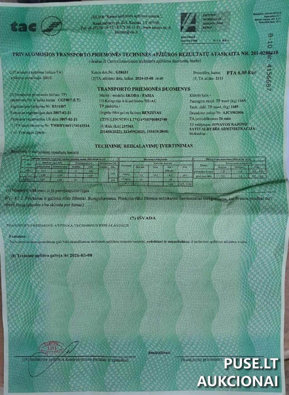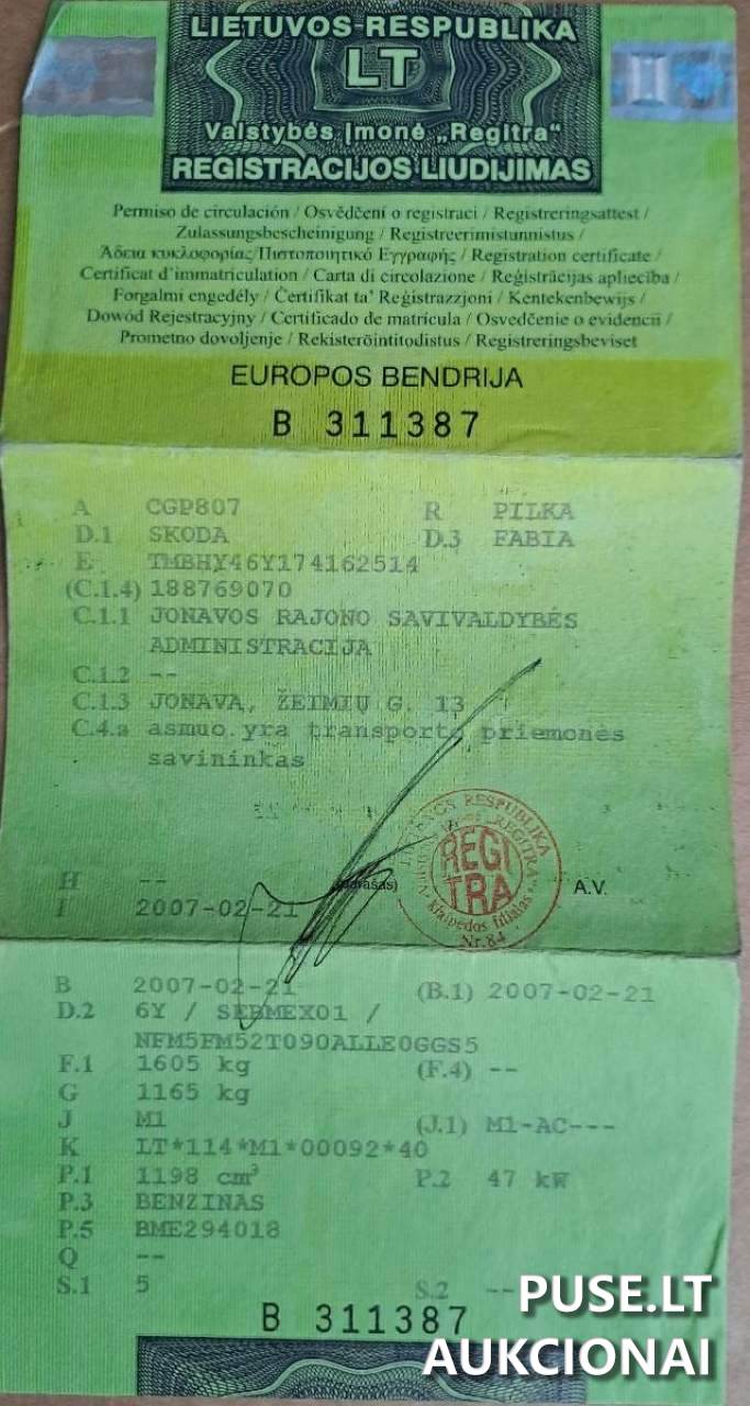Parduodamas lengvasis automobilis Škoda Fabia, registracijos metu turėjęs valstybinį numerį CGP807, aukcione siūlomas kaip lengvasis automobilis pakartotiniame aukcione. Pradinė kaina yra 250 EUR. Automobilis pagamintas 2007 metais, varomas benzinu, variklio darbinis tūris yra 1198 cm3, o galia siekia 47 kW. Rida šiuo metu yra 272592 km. Automobilio identifikavimo numeris yra TMBHY46Y174162514, o SDK kodas – MKPHHAPE.