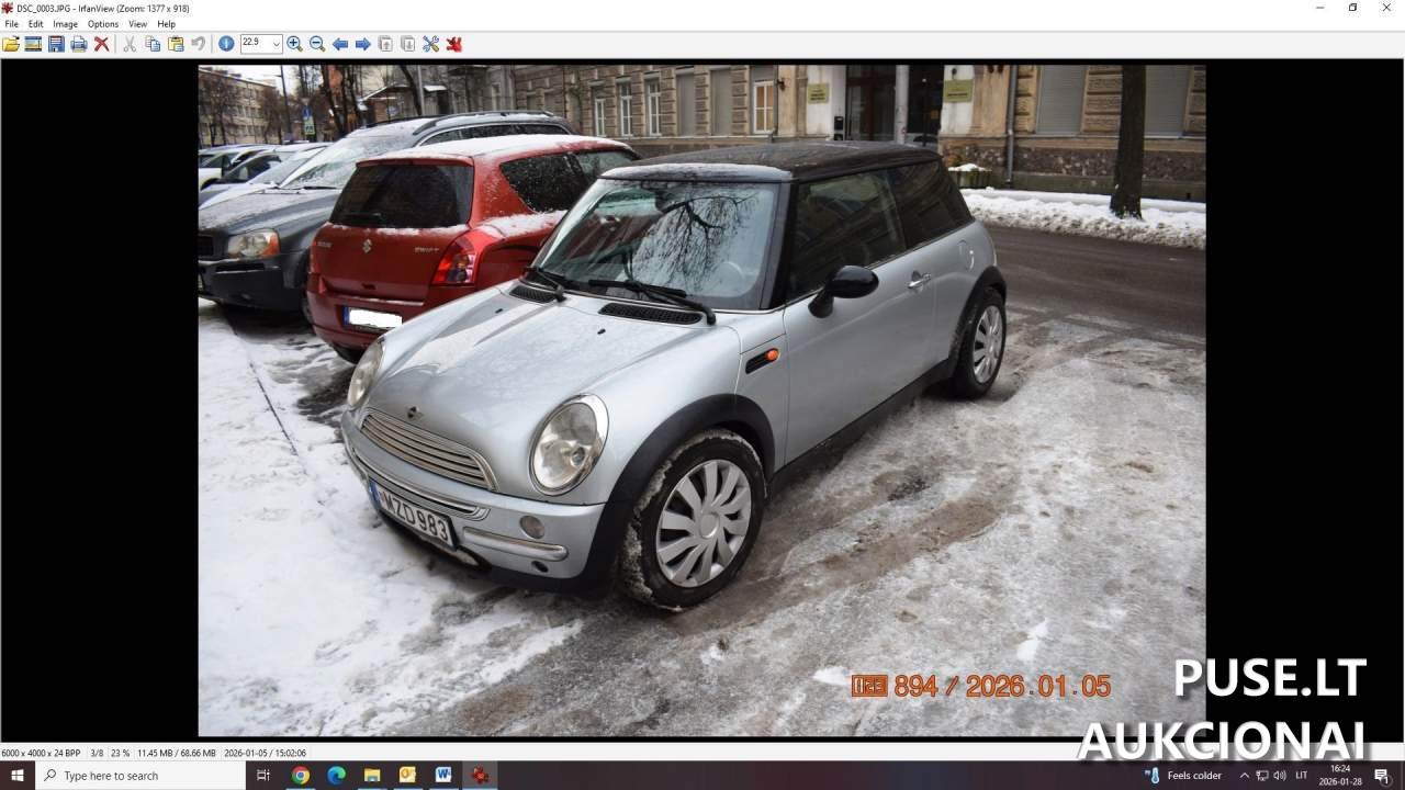 Parduodamas keleivinis automobilis MINI COOPER antstolių varžytynėse. Aukcionas vyksta kaip viešas turto pardavimas. Pradinė kaina, už kurią pradedamas pardavimas, yra 800 EUR. Aukcionas yra vis dar vykstantis. Svarbu atkreipti dėmesį, kad disponavimo teisės apribojimas yra taikomas šiam turtui. Dėl detalesnių pardavimo sąlygų ir visos dokumentacijos prašome kreiptis į organizacijas. Šis lengvasis automobilis yra registruotas pirmojoje varžytynėse kaip keleivinis transporto priemonė. Automobilis parduodamas su galiojančiais disponavimo teisių apribojimais, kol nebus įvykdytos visos prievolės arba nesibaigs aukcionas.