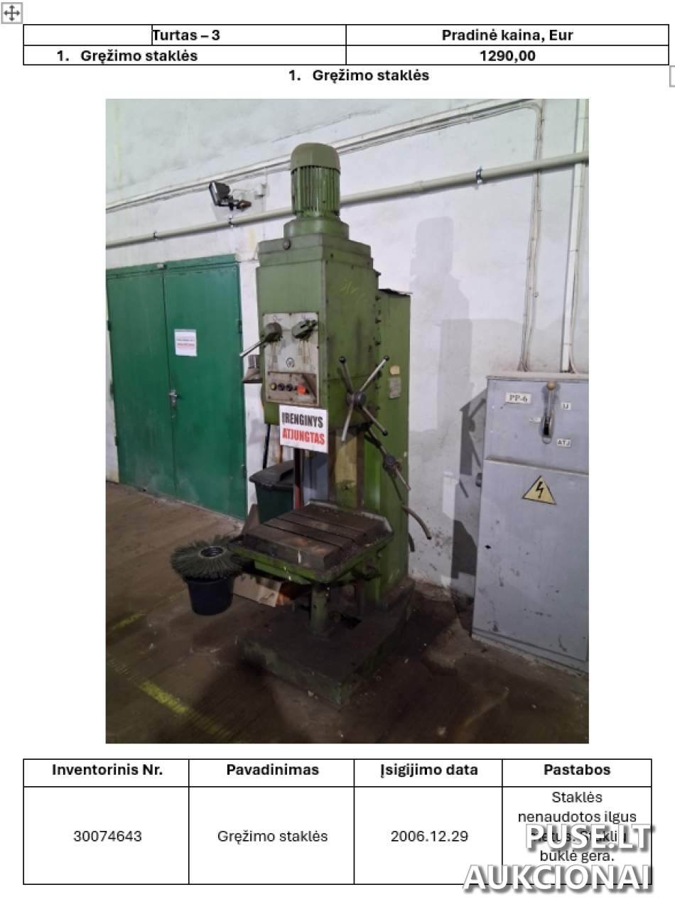 Parduodamos gręžimo staklės pradinėje kaina 1290 EUR kitame turto aukcione. Šis techninės įrangos pardavimas vyksta per AB "Kauno energija" organizuojamą procesą.