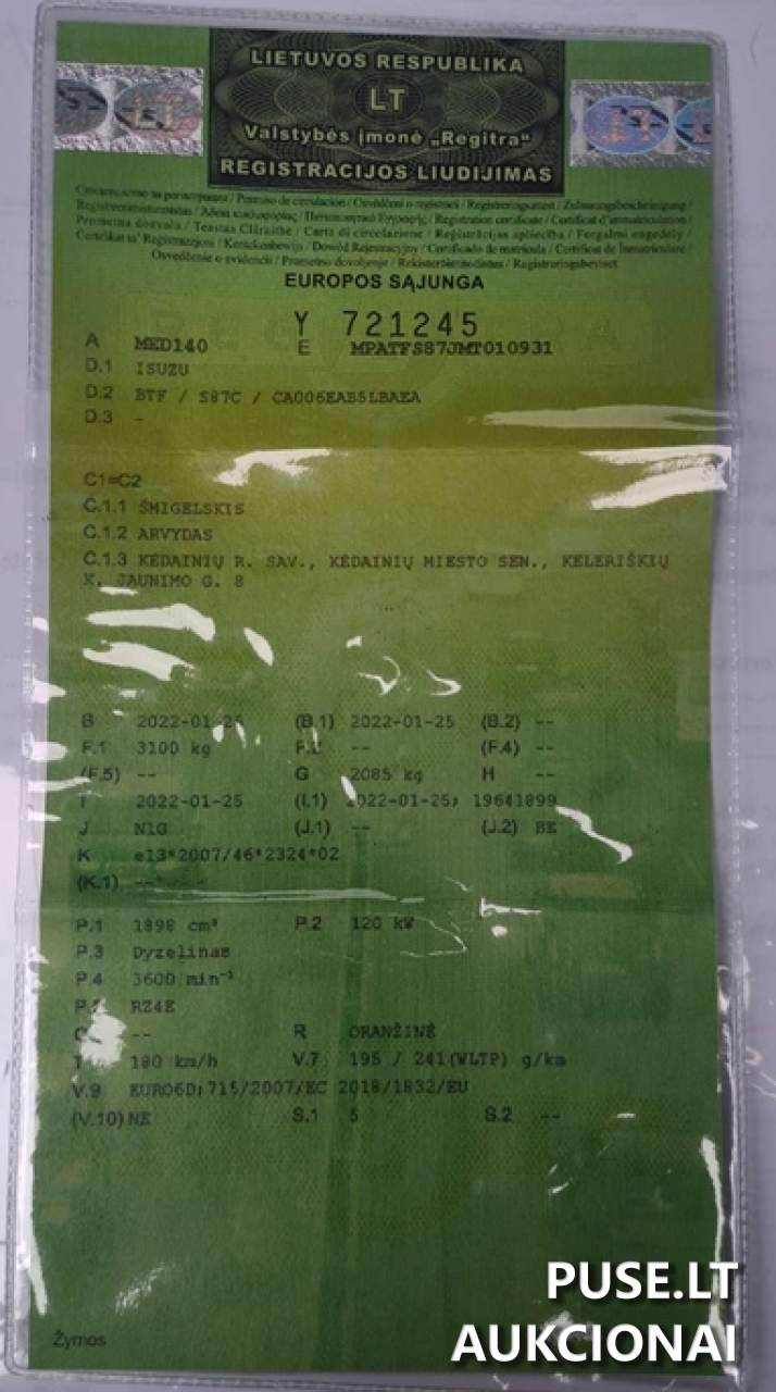 Parduodamas 2022 metų gamybos, pirmą kartą registruotas 2022-01-28, lengvasis automobilis ISUZU aukcione, kurio pradinė kaina yra 32000 EUR. Tai yra dyzelinio kuro tipo transporto priemonė su automatine pavarų dėže ir fiksuota rida - 67295 km. Transporto priemonės identifikavimo numeris yra MPATFS87JKMT010931. Aukcionas vyksta nemokumo administratoriaus varžytynių pagrindu ir yra klasifikuojamas kaip pirmosios kategorijos lengvasis automobilis.