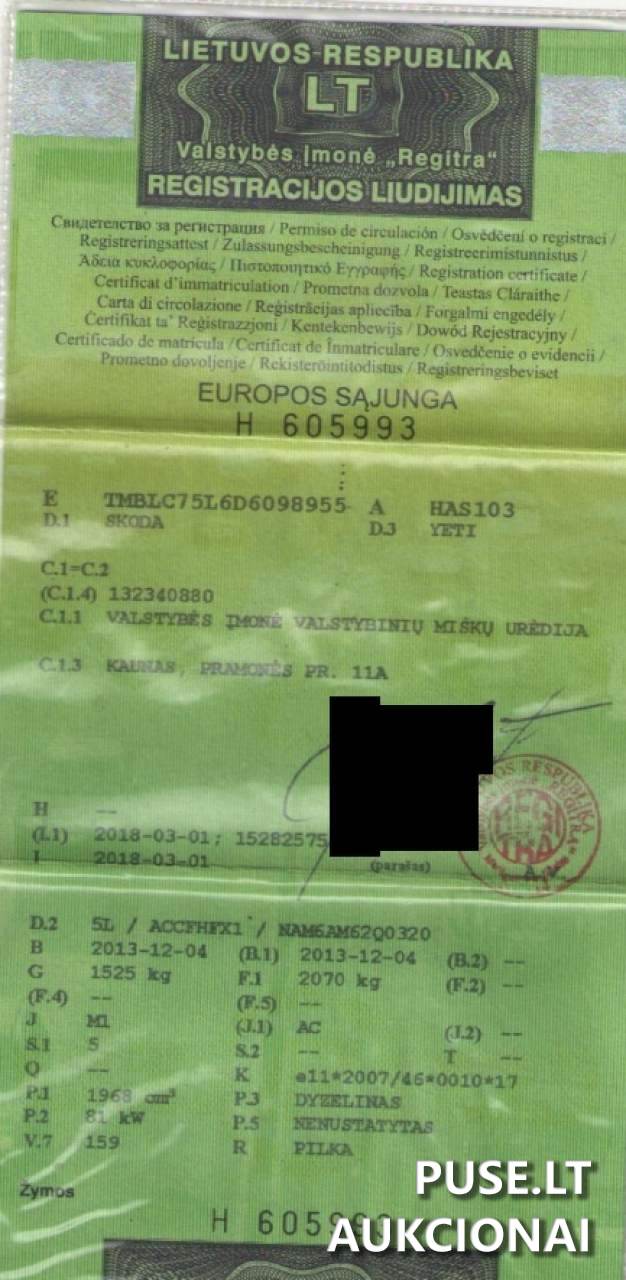 Parduodamas lengvasis automobilis SKODA YETI kitame aukcione, kurio pradinė kaina yra 4200 EUR. Galimybė įsigyti automobilį, kuriam reikalingas remontas ir kuris šiuo metu neturi galiojančios techninės apžiūros.