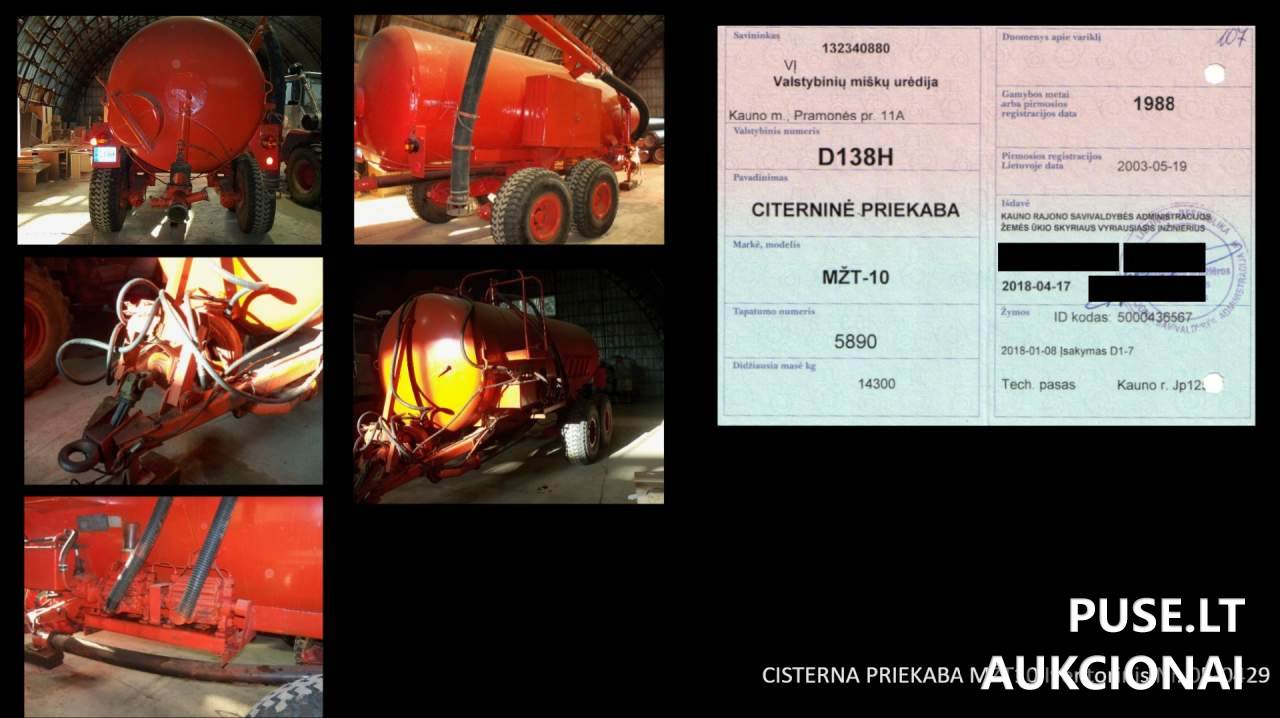 Parduodama cisterninė puspriekabė MŽT-10 (ID: 83191) per Valstybės įmonės Valstybinių miškų urėdijos organizuojamą kitą aukcioną. Pradinė pardavimo kaina yra 890 EUR su PVM. Šis transporto priemonių aukcionas yra registruojamas kaip Paskelbtas, Kiti aukcionai tipas.