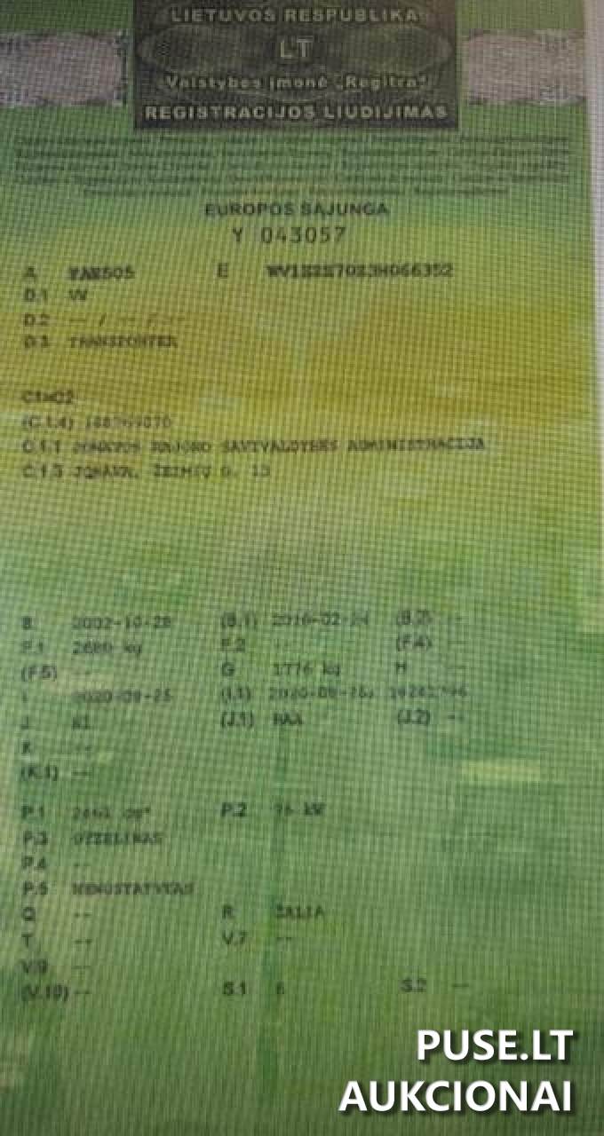 Parduodamas naudotas keleivinis mikroautobusas VW Transporter 2002 metų gamybos, siūlomas pakartotiniame aukcione. Pradinė kaina sudaro 1100 EUR. Automobilis varomas dyzeliniu kuru, variklio darbinis tūris 2461 cm3, galia 75 kW. Identifikavimo numeris - WV1ZZZ70Z3H066352, SDK kodas - EKFFHFRP. Rida – 292799 km. Svarbu paminėti, kad transporto priemonė neturi galiojančios techninės apžiūros.