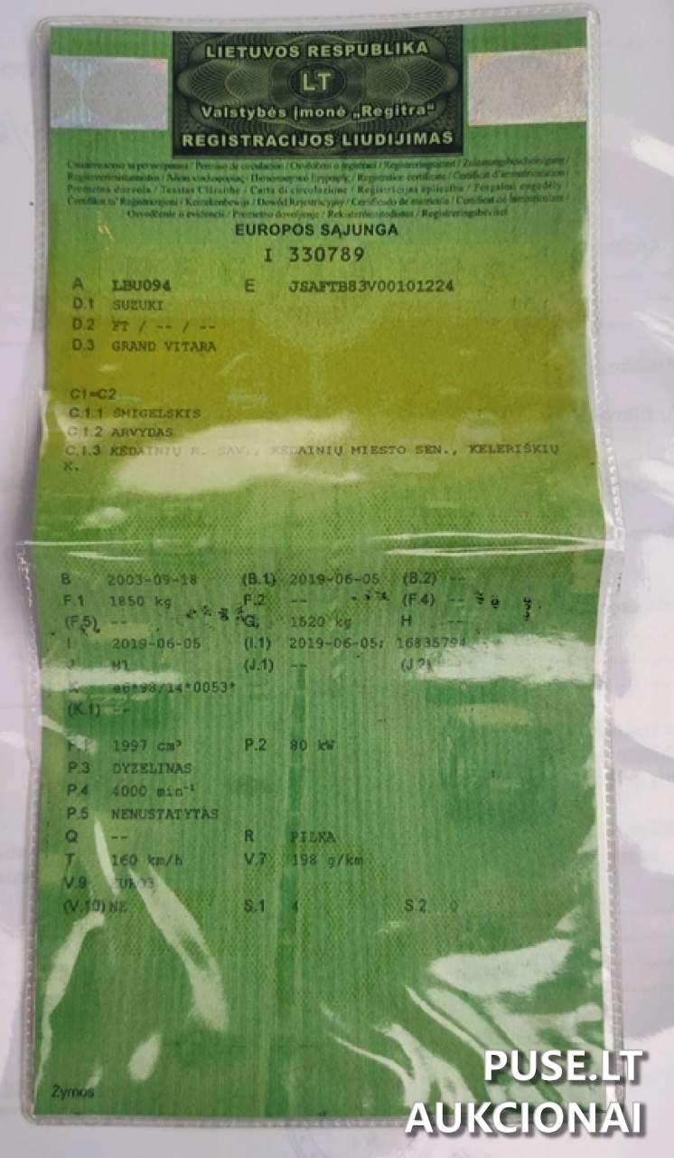 Parduodamas lengvasis automobilis SUZUKI GRAND VITARA, dalyvaujantis vykstančiose, nemokumo administratorių varžytynėse, su pradine kaina 5000 EUR. Tai yra pirmosios kategorijos transporto priemonė.