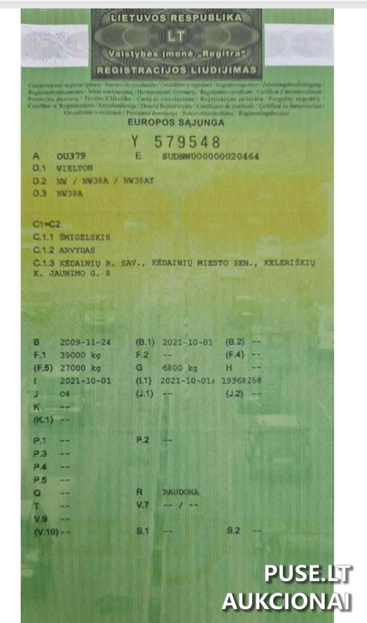Parduodama pirmosios kategorijos krovininė priekaba arba puspriekabė (virš 10t) WIELTON NW 38, turinti 6800 kg bendrą masę ir 27000 kg didžiausią leidžiamą masę. Ši priekaba, kurios pagaminimo data (pirmoji registracija) 2009 m. lapkričio 24 d., parduodama viešų varžytynių būdu, kurias vykdo nemokumo administratorius.