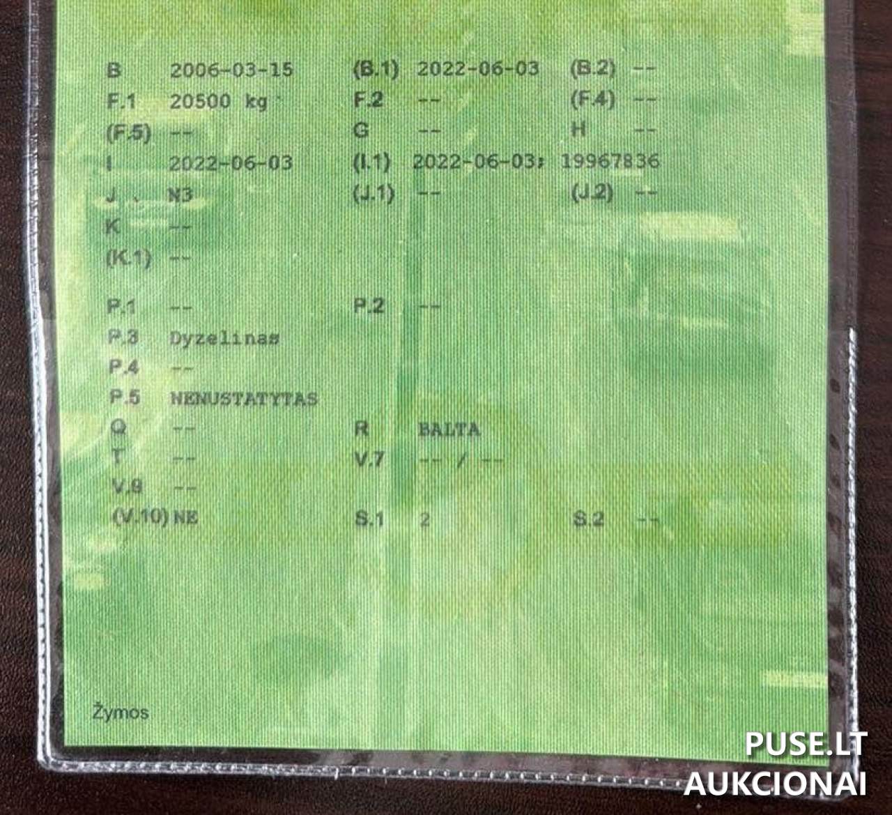 Transporto priemonės identifikavimo duomenys: pagaminta 2006 metais, pirmoji registracija 2006-03-15. Variklis dyzelinis, pavarų dėžė mechaninė, kėbulo tipas nurodomas kaip furgonas, transporto priemonės kategorija N3, spalva - balta. Transporto priemonė yra įregistruota, tačiau dalyvavimas viešajame eisme draudžiamas, techninė apžiūra negalioja, civilinės atsakomybės draudimas nėra taikomas.