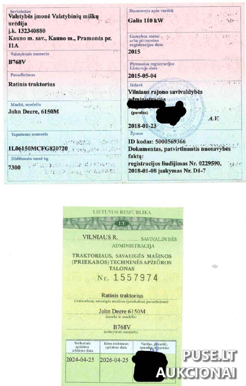 Parduodamas naudotas 2015 metų John Deere 6150M traktorius aukcione, kurio pradinė kaina yra 45000 EUR su PVM, tačiau nurodoma, kad šiam technikos vienetui reikalingas remontas. Būklė yra bloga, nes technikos prietaiso elektros instaliacija sudegė gaisro metu, taip pat iškomplektuota galinė pakaba.