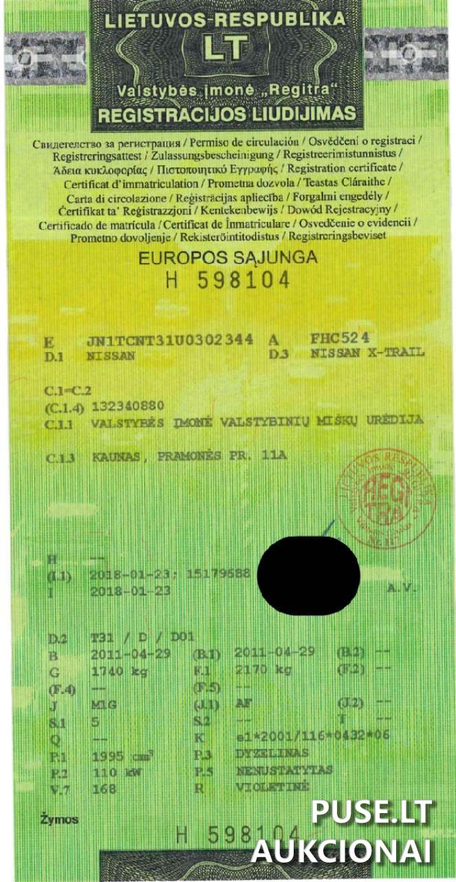 Parduodamas lengvasis automobilis Nissan X-Trail, pagamintas 2011 metais, su dyzeliniu kuro tipu, aukcione, kurį organizuoja Valstybės įmonė Valstybinių miškų urėdija (įmonės kodas 132340880).