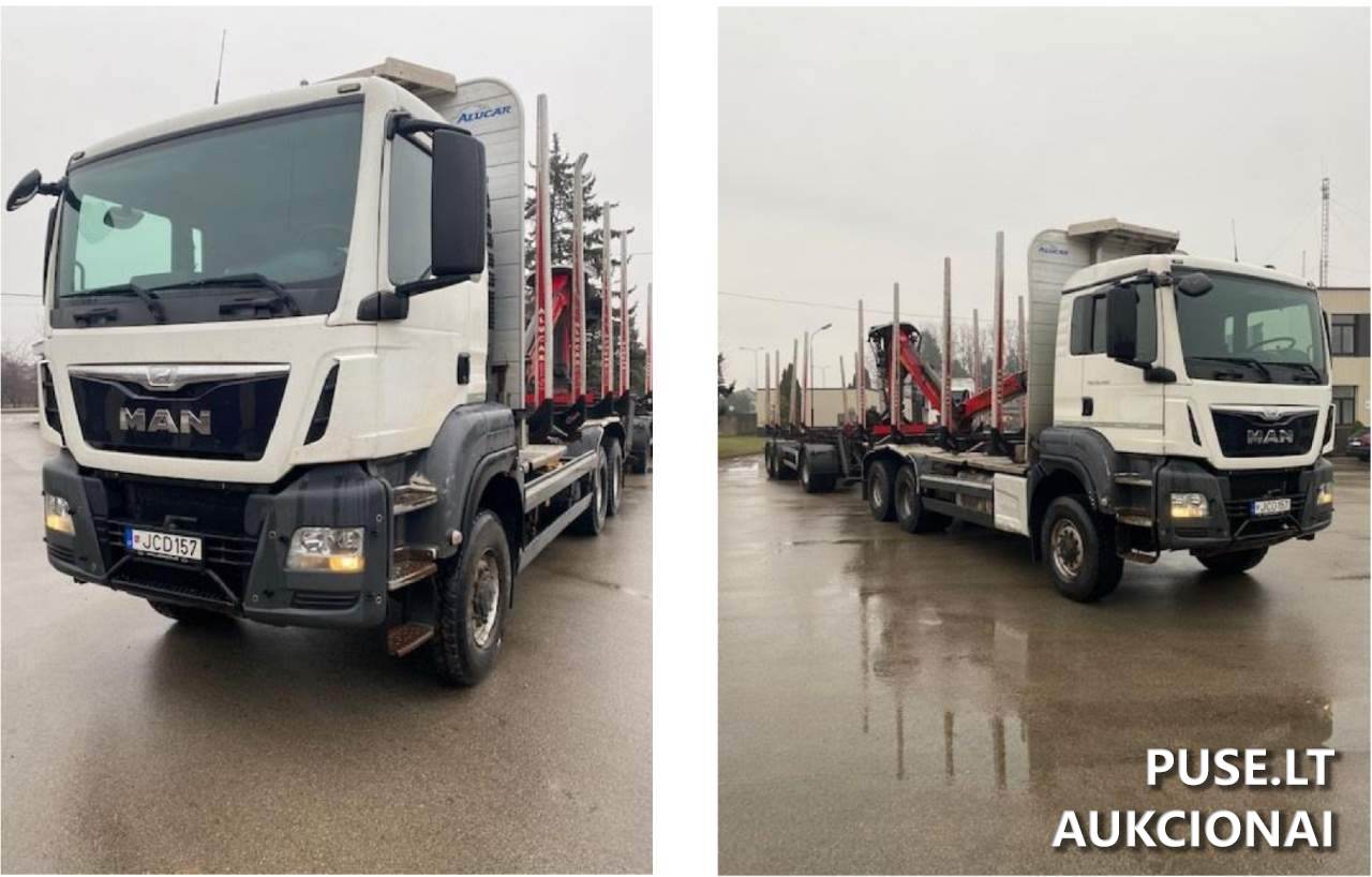 Parduodamas transporto priemonių komplektas aukcione: sunkvežimis MAN kartu su SOLOS priekaba (Inv. Nr. 14-124000006 14-150406). Bendra pradinė kaina yra 27900 EUR (su PVM). Šis krovinių pervežimo agregatas parduodamas kaip vienas komplektas, tačiau jo techninė būklė yra prasta – sunkvežimis MAN turi valstybinį numerį JCD157, kurio techninė apžiūra jau pasibaigusi, kėbulas paveiktas korozijos, o ir priekabos SOLOS techninė apžiūra taip pat negalioja.