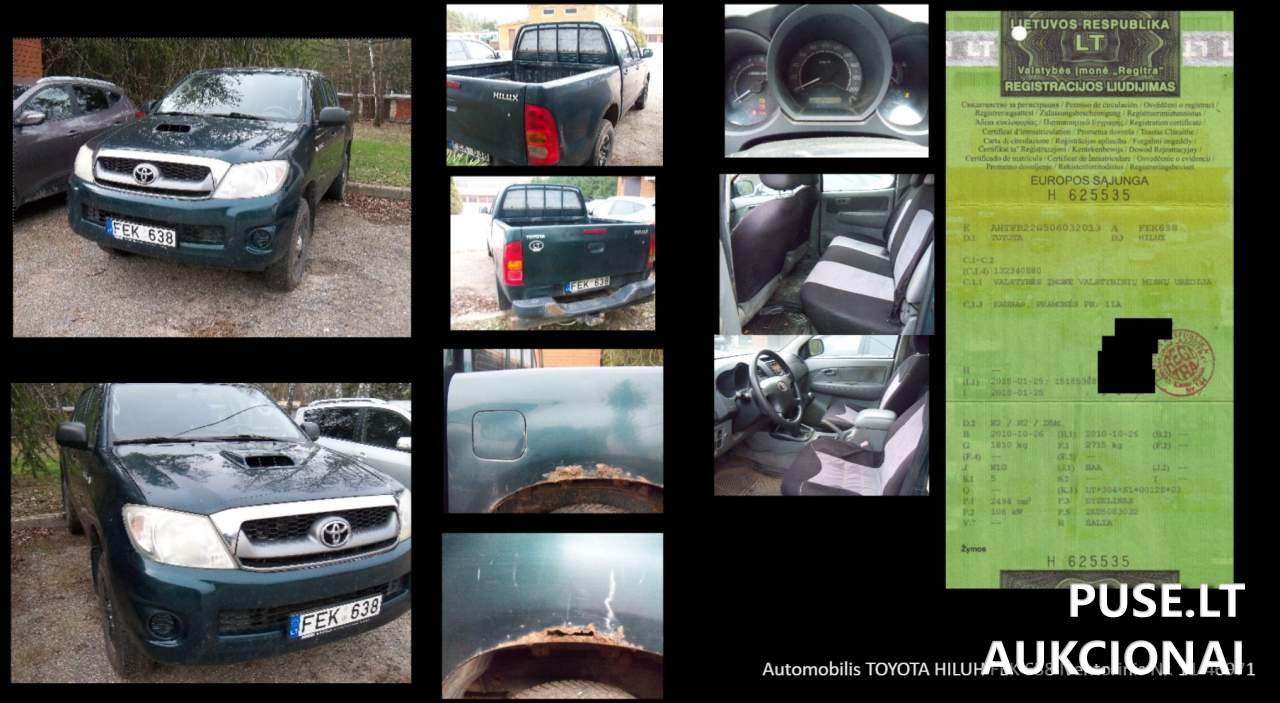Parduodamas lengvasis automobilis Toyota Hilux, 2010 metų gamybos, siūlomas aukcione su pradine 6800 EUR kaina. Automobilis parduodamas esant labai blogai techninei būklei, reikalingas kompleksinis remontas. Pirkimas vykdomas per Valstybės įmonės Valstybinių miškų urėdijos organizuojamą aukcioną.