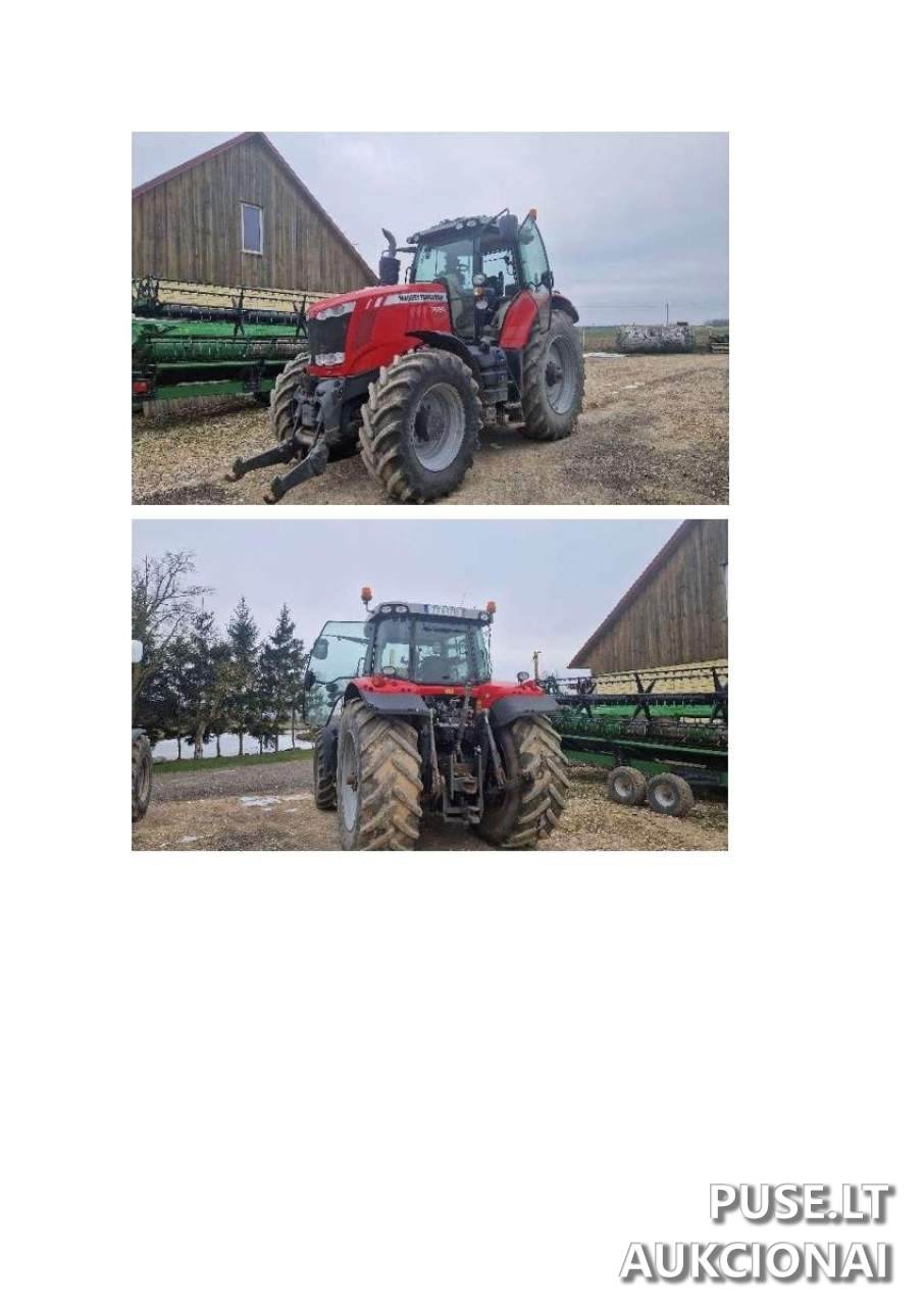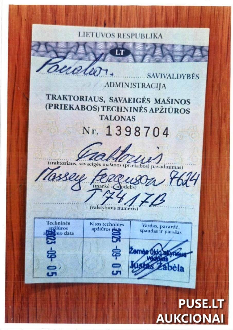 Parduodamas ratinis traktorius modelis Massey Ferguson 7624, dalyvaujantis vykstančiose antstolių varžytynėse. Ši žemės ūkio paskirties mašina, turinti identifikavimo kodą 5000547835 ir registracijos numerį T7417B, siūloma už pradinę 37200 EUR kainą. Traktorius pagamintas 2013 metais, jo variklio galia siekia 182 kW, o didžiausia masė yra 9500 kg. Pirmą kartą Lietuvoje registruotas 2013-05-02, o registracijos liudijimas išduotas 2021-04-09 (statusas Įregistruota, liudijimo numeris 0383950).
