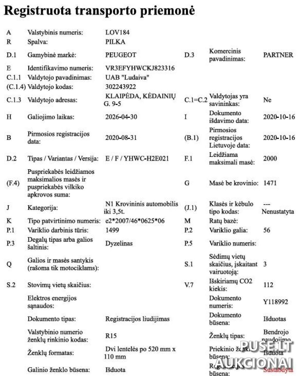 Parduodamas krovininis furgonas Peugeot Partner, pagamintas 2020 metais, su apytikslia rida apie 100 000 kilometrų. Ši transporto priemonė parduodama priverstinio pardavimo tvarka, vadovaujantis Lietuvos Respublikos įstatymų nuostatomis.