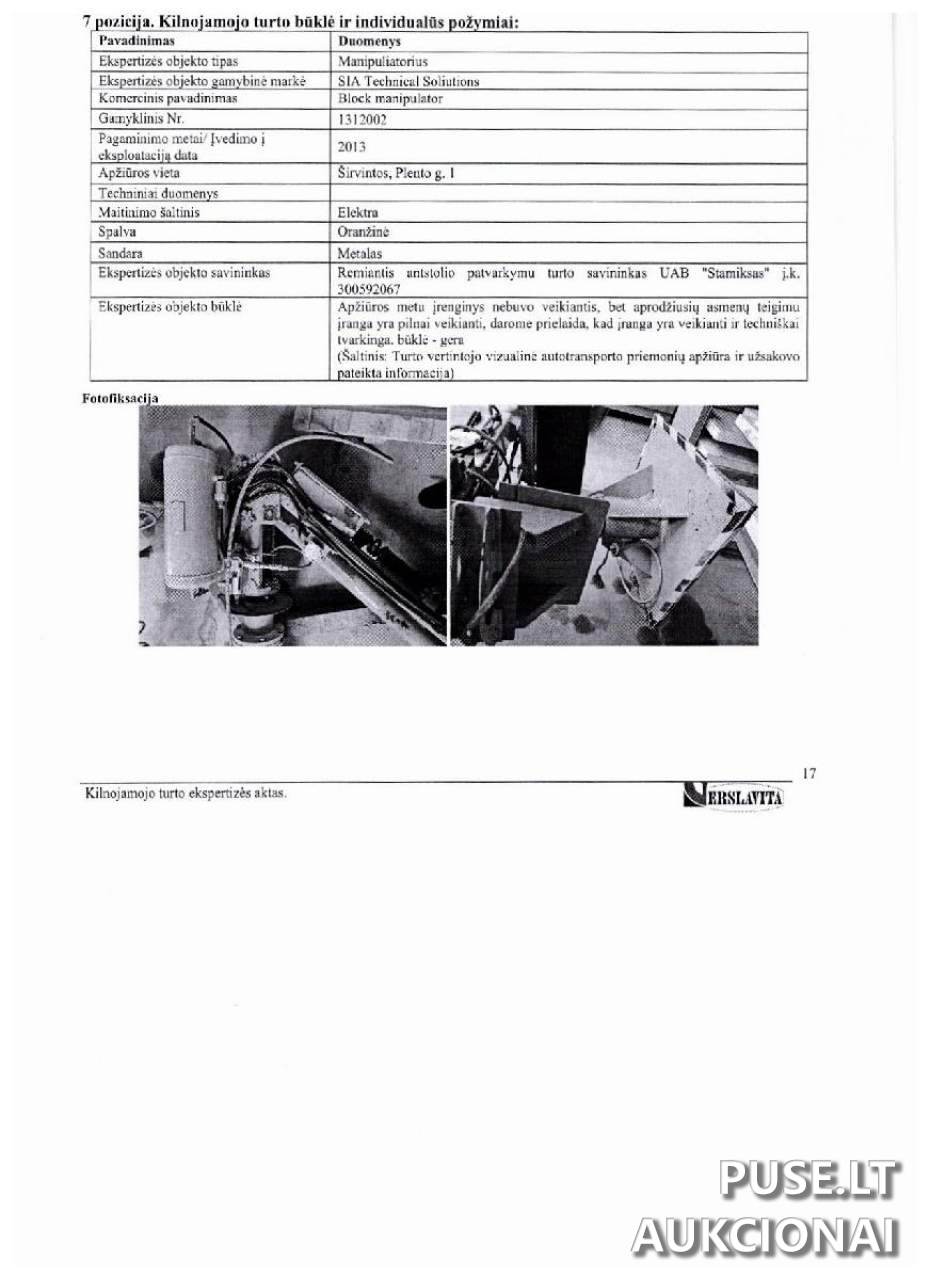 Objektas yra priskirtas antrosios kategorijos mašinoms ir įrengimams (Manipuliatorius), o jo statusas yra Vykstančios, Antstolių varžytynės, nes turtas yra areštuotas.