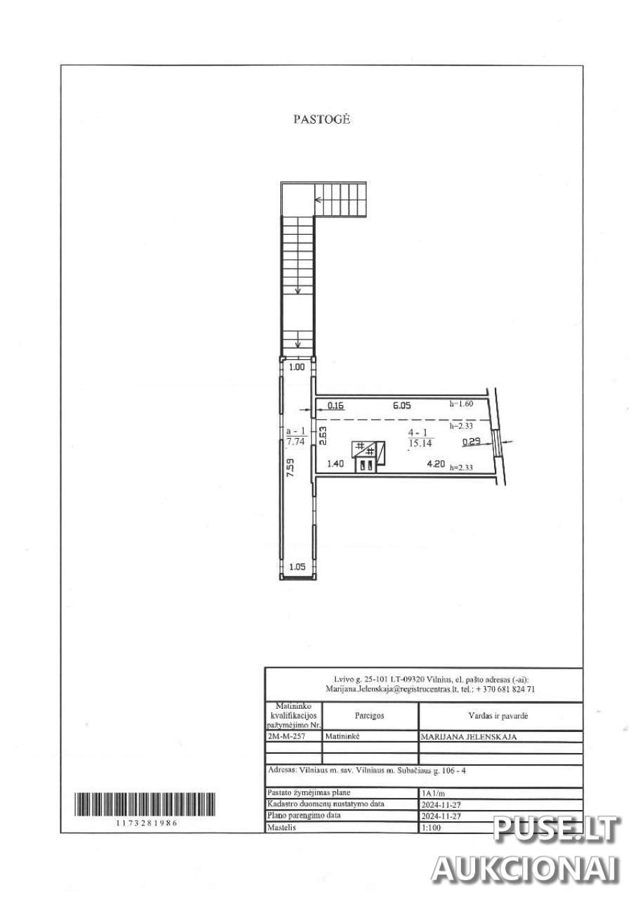 Parduodama 15,14 kv. m patalpų dalis ir 2,02 kv. m bendrojo naudojimo patalpų dalis. Unikalus kodas yra 1094-0368-4011:0006.