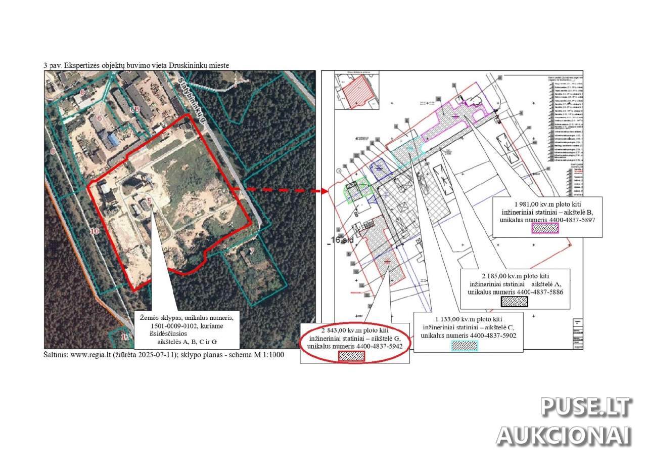 Parduodama 1/2 dalis inžinerinio statinio - aikštelės (kodas G) Druskininkų savivaldybėje, Druskininkų mieste, Statybininkų g. 5. Ši betoninė aikštelė, pastatyta 1985 metais, užima 2843 kvadratinių metrų plotą. Bendra pradinė aukciono kaina yra 26320 EUR. Aukcionas vyks nuo 2025-09-15 09:55:13 iki 2025-10-15 09:55:59, tai yra vykstančios antstolių varžytynės.