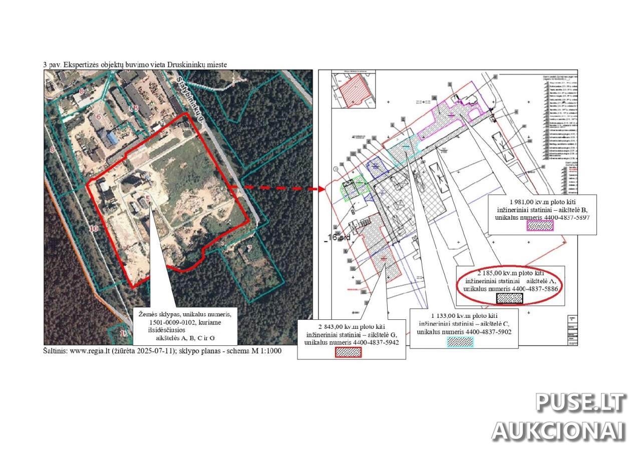 Parduodama aikštelė yra suformuota 7,0072 ha ploto žemės sklype (Unikalus Nr. 1500-0009-0102). Šis žemės sklypas nuosavybės teise priklauso Lietuvos Respublikai, o patikėjimo teisė suteikta Druskininkų savivaldybei. Tarp žemės sklypo patikėtinio ir aikštelės savininkų yra galiojanti nuomos sutartis, kuri yra svarbi sąlyga. Būtinina atkreipti dėmesį, kad turto disponavimo teisė yra apribota dėl turto arešto.