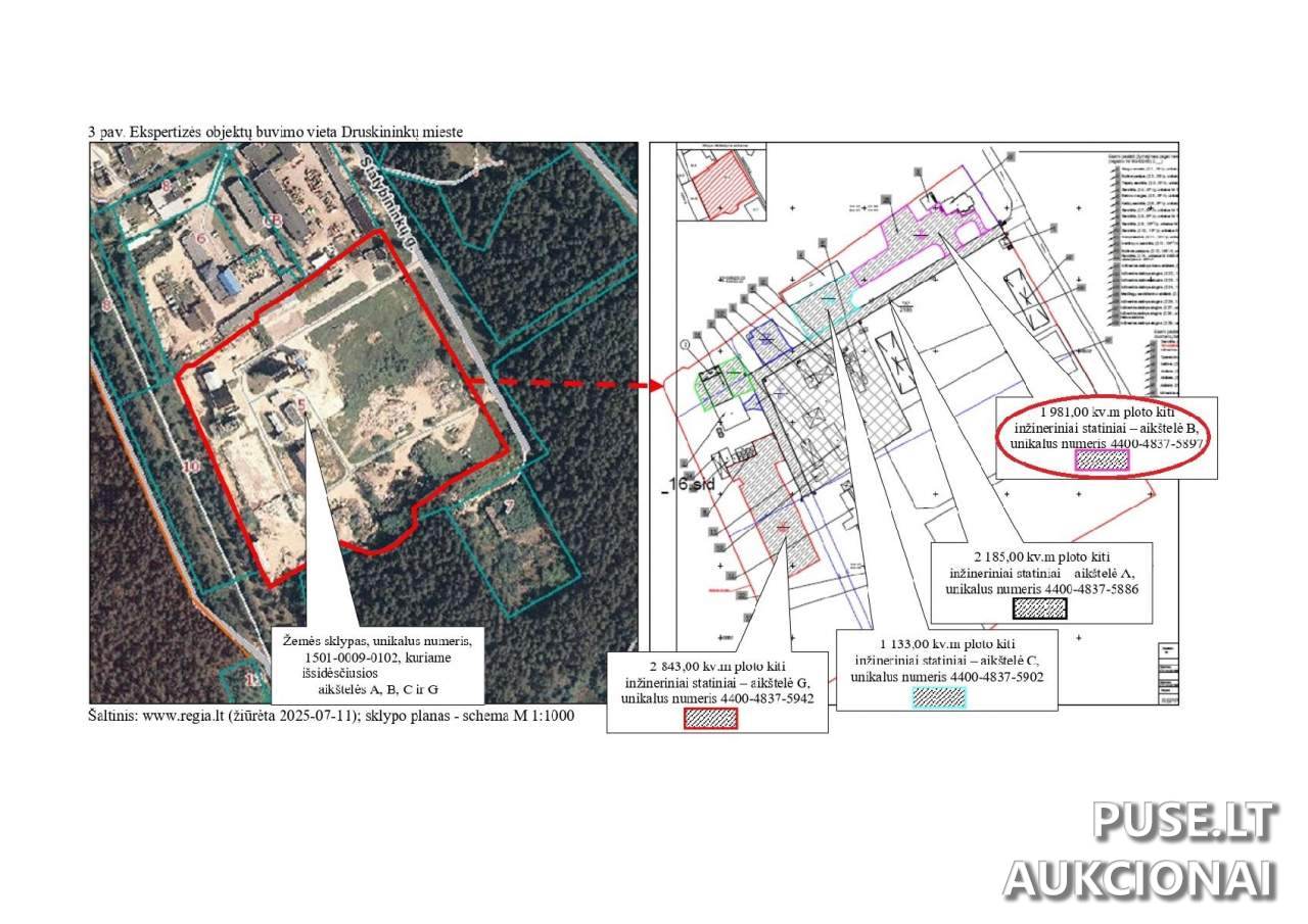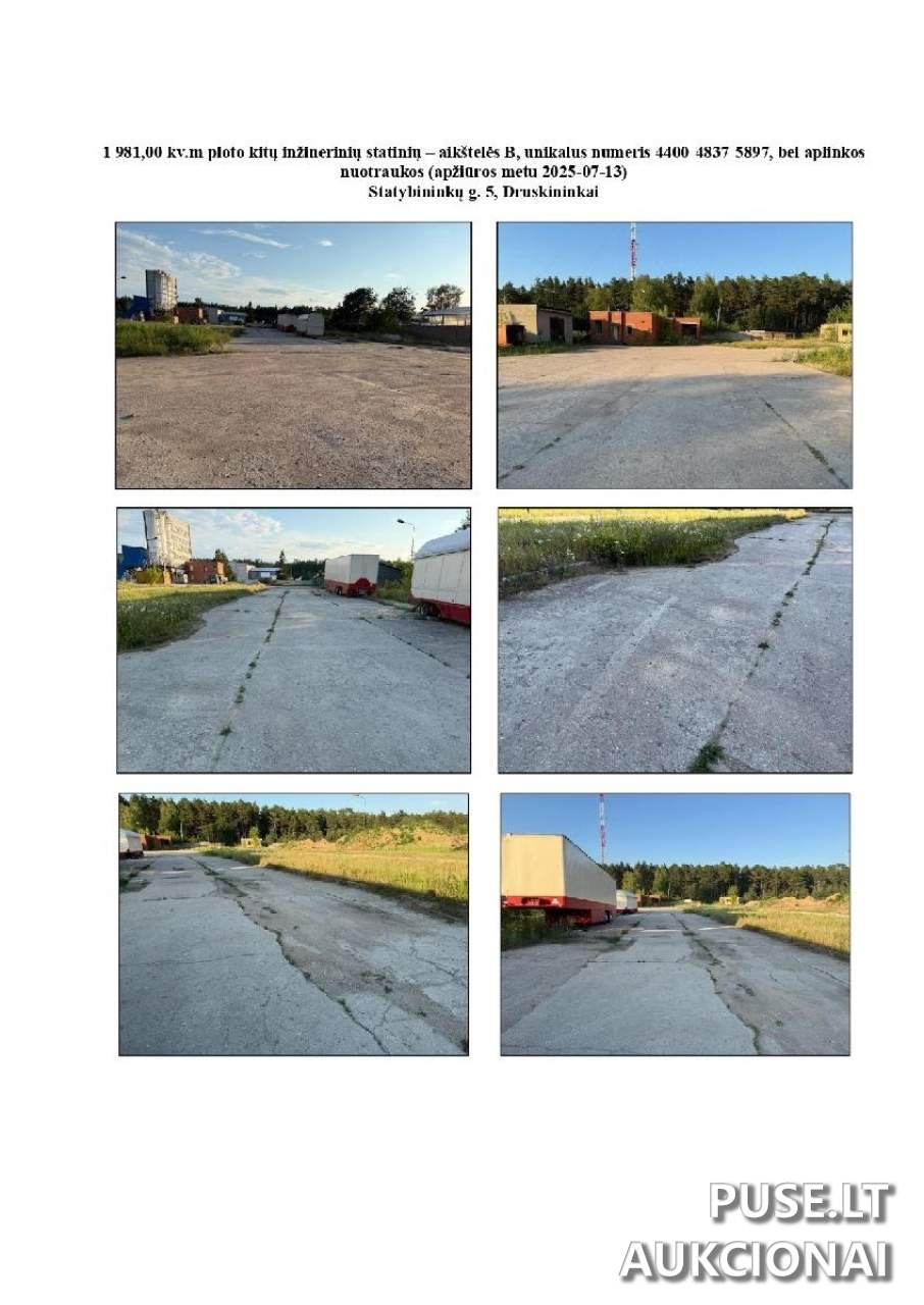 Parduodama 1/2 dalis inžinerinio statinio - asfaltuotos aikštelės B, esančios Druskininkų savivaldybėje, Statybininkų g. 5. Ši atviro tipo aikštelė yra 1981 kv. m. ploto, pastatyta 1985 metais. Tai puiki galimybė įsigyti dalį komercinės paskirties objekto Druskininkų mieste. Aikštelė yra išsidėsčiusi dideliame, 7,0072 ha ploto žemės sklype, kurio pagrindinė naudojimo paskirtis – pramonės ir sandėliavimo objektų teritorijos. Žemės sklypas nuosavybės teise priklauso Lietuvos Respublikai, o patikėjimo teisė suteikta Druskininkų savivaldybei. Pardavėjo ir žemės sklypo patikėtinio tarpusavio santykiai reguliuojami nuomos sutartimi.