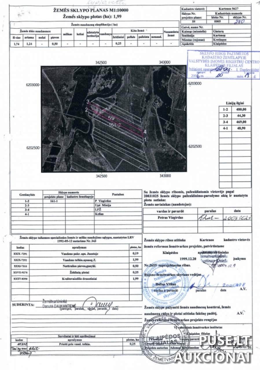 Parduodamas 1/6 dalimis nuosavybės teise priklausantis žemės ūkio paskirties žemės sklypas Kretingos rajono savivaldybėje, Gintarų kaimo teritorijoje, kurio bendras plotas yra 1.9900 hektaro. Šis turtas parduodamas vykstančių antstolių varžytynių būdu. Kadastro numeris 5627/0005:280, unikalus numeris 4400-0959-1224. Sklypas suformuotas atliekant preliminarius matavimus, o duomenų nustatymo data yra 2003-10-25. Iš bendro 1.9900 ha ploto, žemės ūkio naudmenų plotas siekia 1.7400 ha, iš kurio 1.2400 ha yra ariama žemė, o 0.5000 ha sudaro pievos ir natūralios ganyklos. Kitos žemės plotas nurodytas kaip 0.2500 ha. Žemės ūkio naudmenų našumo balas yra 29.0.