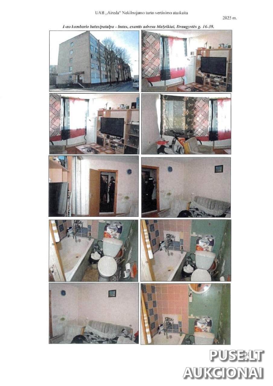Parduodamas 1 kambario butas Mažeikių miesto savivaldybėje, Draugystės g. 16, 39 bute, kurio bendras plotas siekia 22.61 kv. metro, o pradinė kaina antstolių varžytynėse yra 9200 EUR. Šis butas priklauso įvairių socialinių grupių paskirties grupei ir yra 1980 metais statyto pastato 3-iame aukšte. Pastato atliktas baigtumas yra 100 %.