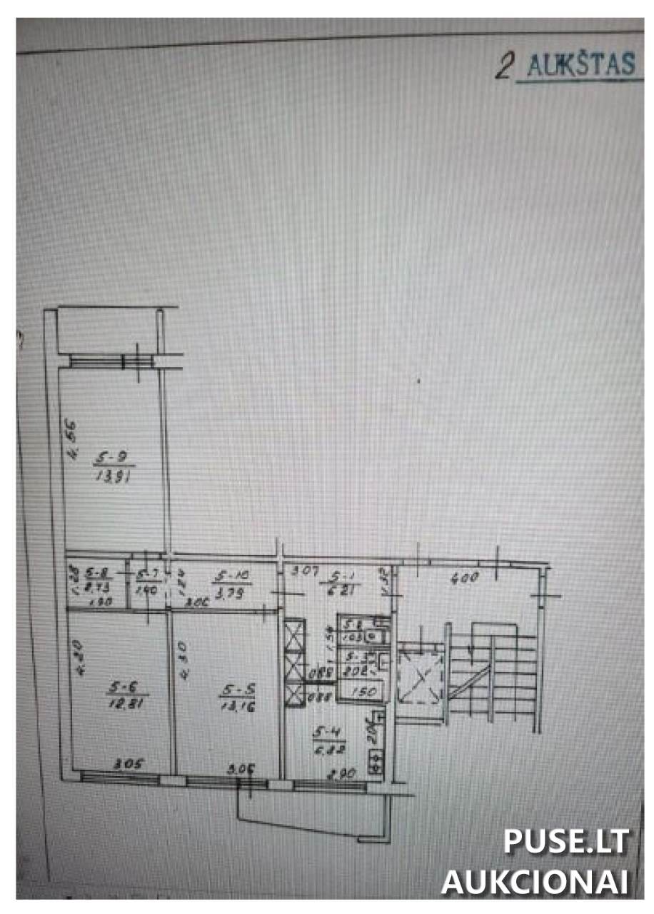 Parduodama 59/100 dalis trijų kambarių buto, kurio bendras plotas yra 63.58 kv. m. Butui taip pat priklauso rūsys.