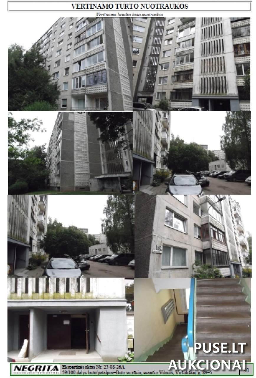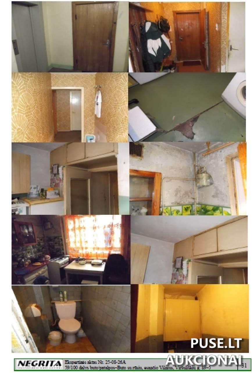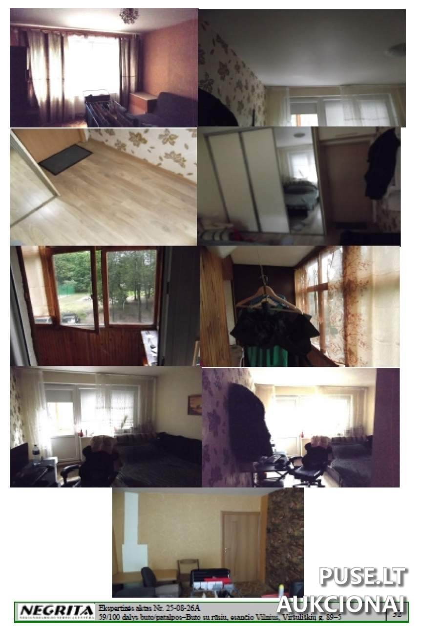 Parduodama 59/100 dalis 3-jų kambarių buto su rūsiu Vilniaus mieste, Viršuliškių gatvėje 89-5. Bendras šio parduodamo objekto buto plotas yra 63.58 kvadratinių metrų. Šio turto unikalus numeris - 1097-8015-7013:0059. Pardavimo procesas vyksta Antstolių varžytynių būdu. Pradinė kaina, nuo kurios prasideda aukcionas, nustatyta 43040 EUR dydžio. Aukcionas prasidės 2025 m. rugsėjo 29 d. 12:30:00 ir baigsis 2025 m. spalio 29 d. 12:30:59. Vykstantys varžytynės yra susiję su disponavimo teisių apribojimu, hipoteka bei turto areštu. Pardavimą vykdo Antstolio Ginto Badikonio kontora.