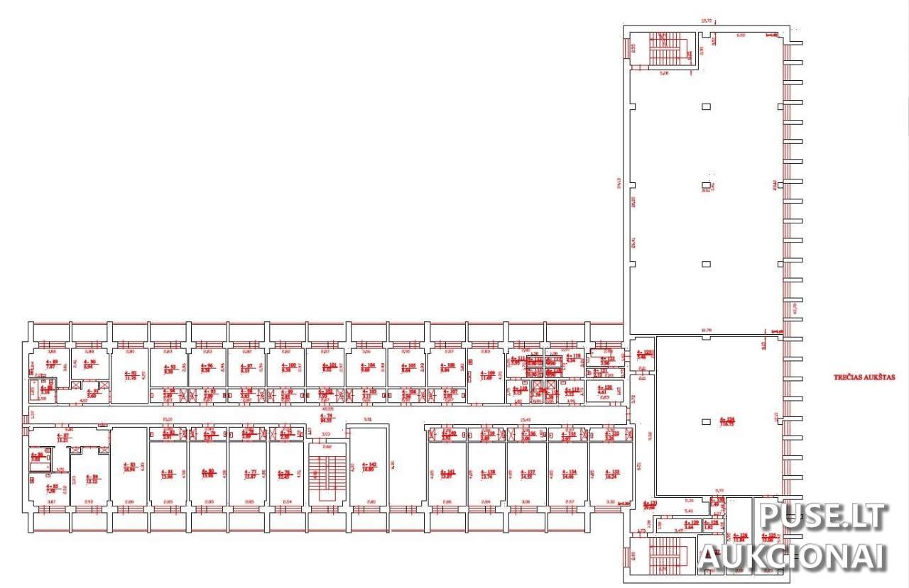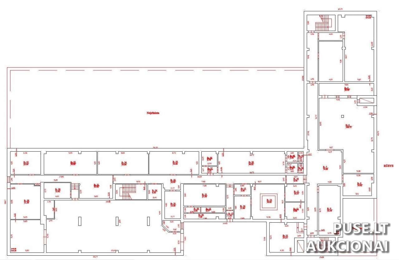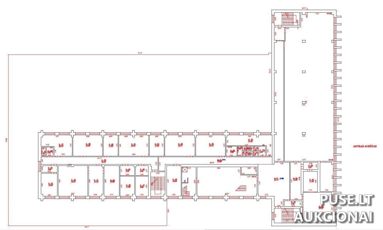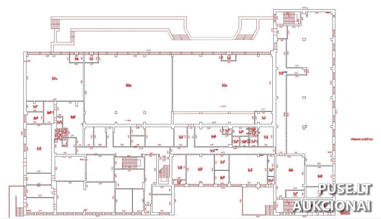 Pradinė aukciono kaina yra 1259200 EUR. Bendras parduodamos dalies plotas yra 2901,12 kv. m, o su bendro naudojimo patalpomis - 3058,65 kv. m.