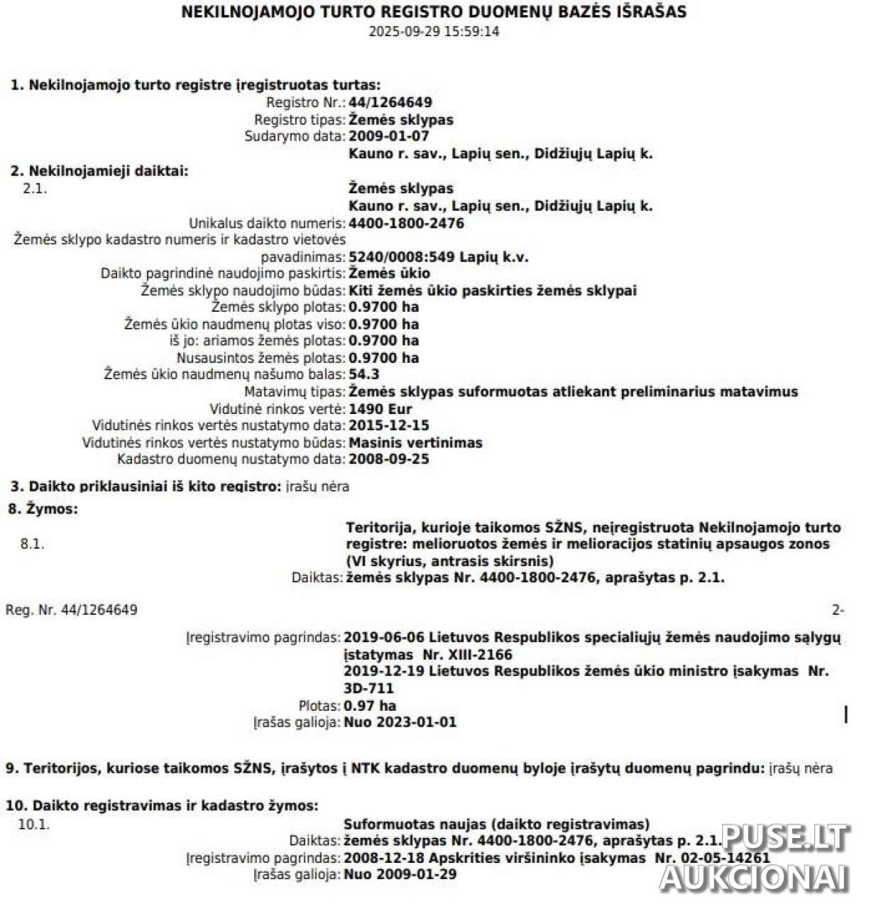 Parduodamas 0,97 ha ploto žemės ūkio paskirties žemės sklypas Kauno rajono savivaldybėje, Lapių seniūnijoje, Didžiųjų Lapių kaime. Šis ilgalaikės investicijos objektas turi 54.3 žemės ūkio naudmenų našumo balą. Visos parduodamos dalys yra 1/1. Svarbu atkreipti dėmesį, kad turtui yra taikomas areštas, kuris galimas bus pašalintas pardavimo teisiniu pagrindu. Aukciono metu taikomas šis unikalus numeris 4400-1800-2476 ir kadastrinis numeris 5240/0008:549.