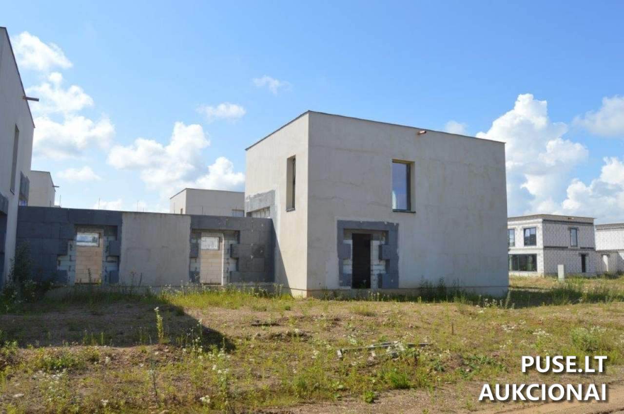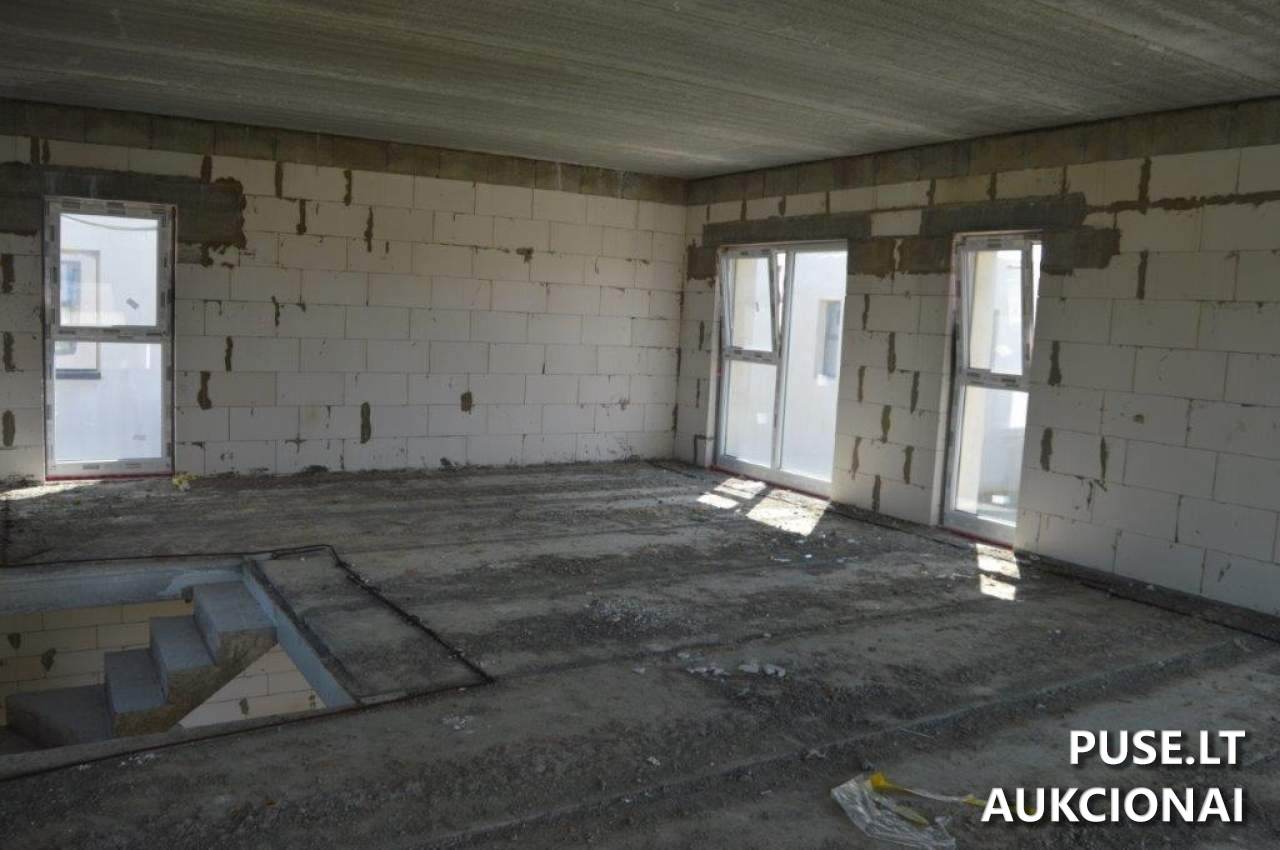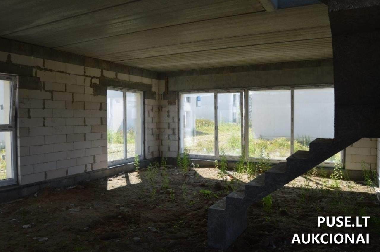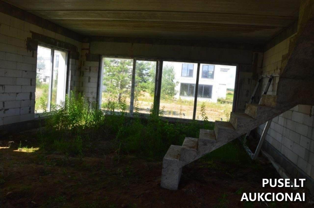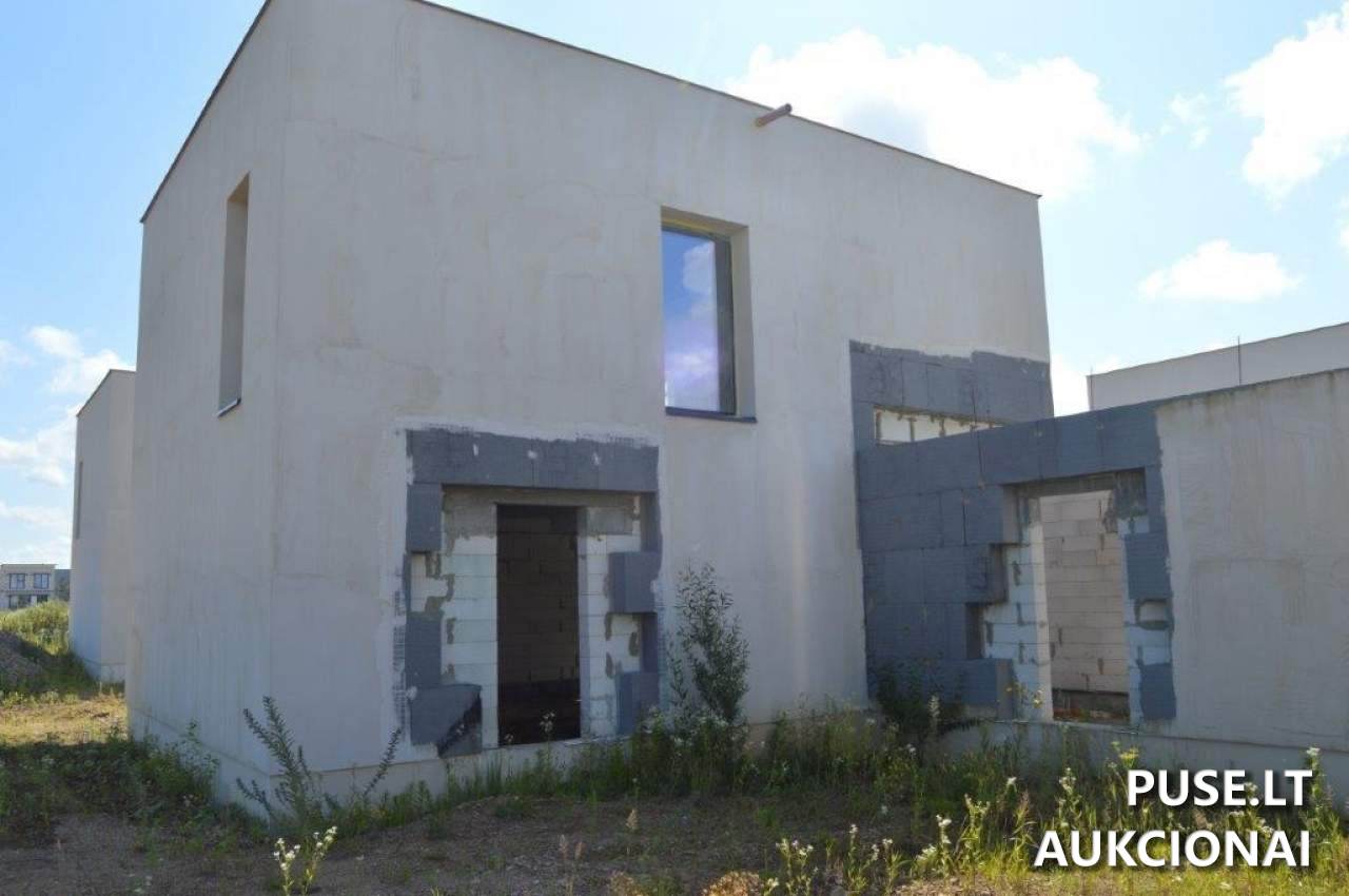 Dvibutis gyvenamasis namas, adresu Vilnius, Grinapolio g. 62 (unikalus nr. 4400-6049-9018). Dviejų aukštų pastatas, vertinamas ir bendras plotas 285,28 m², užstatytas plotas 181 m², tūris 1054 m³. Statybos pradžia ir pabaiga 2023 m.; registruotas baigtumas 54 %, faktinis apie 60 %. Konstrukcijos: 200 mm akyto betono blokeliai, gelžbetoninės perdangos, gelžbetonio pamatai, plokščiasis bituminis stogas. Langai sumontuoti (plastiški rėmai su stiklo paketais), durų nėra. Vidaus apdaila ir inžineriniai tinklai nebaigti: elektros įvadas yra; dujų, šildymo, vandentiekio ir nuotekų tinklai neįrengti. Žemės sklypas suformuotas po pastatu, turtas vertinamas 57.31 verčių zonoje (mažesnės kainos, periferinė miesto dalis). Pardavimo dalis: 1/1. Apribojimai: hipotekos nutartis, turto areštas. Aukciono pradinė kaina 1 927 800 EUR. Dėl registracijos, apžiūros ir papildomos informacijos kreiptis į antstolių kontorą (žr. kontaktus antstolio paskelbtoje informacijoje).