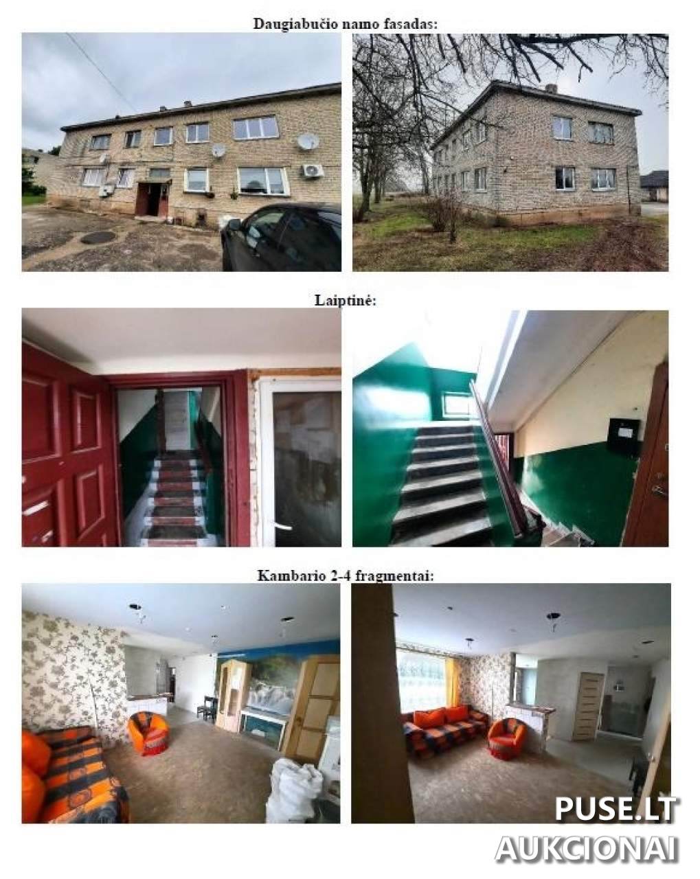 Iš antrųjų varžytynių parduodamas gyvenamasis butas (47,11 m²) kartu su pagalbiniu ūkinio paskirties pastatu ir 0,1300 ha žemės ūkio paskirties sklypu. Sklypo žemės ūkio naudmenų našumo balas – 47,0. Pardavimo forma: antstolių varžytynės. Pradinė kaina: 9 000 EUR. Objekto adresas: Kauno r. sav., Vandžiogalos sen., Boniškių k., Žemdirbių g. 1-2. Unikalus numeris: 5296-2014-2018:0002. Apribojimai: disponavimo teisės apribojimas. Dokumente pateikti duomenys apie buto plotą, pagalbinį pastatą ir žemės sklypo plotą bei našumo balą – išsaugoti.