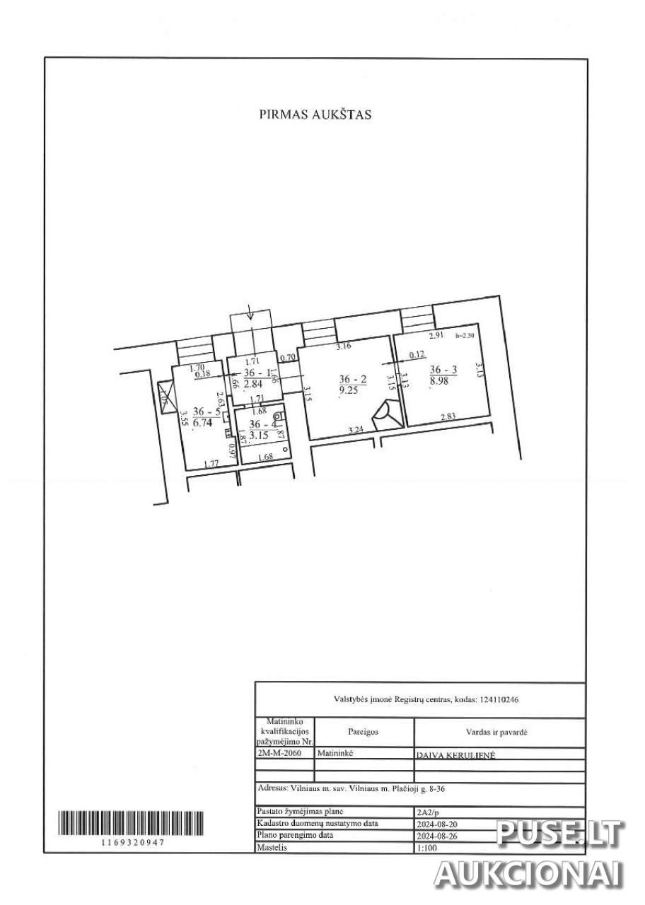 Butas, unik. Nr. 1094-0176-6020:0048, 30,96 kv. m, įrengtas pirmame aukšte iš 2 aukštų mūrinio pastato; adresas Plačioji g. 8-36, Vilnius. Patalpos yra nekilnojamosios kultūros vertybės - Namų kompleksas (Kultūros vertybių registro kodas 33747) ir Namų komplekso pirmas namas (Kultūros vertybių registro kodas 10626). Kultūros paveldo objektų naudojimas, tvarkymas ir statybos darbai (remontas, rekonstrukcija) reglamentuojami Lietuvos Respublikos nekilnojamojo kultūros paveldo apsaugos įstatymu ir kitais teisės aktais; pirkėjas privalo laikytis paveldo apsaugos reikalavimų. Patalpos parduodamos esamos būklės. Skolų už elektros energijos tiekimą objektui nėra. Savivaldybė neįsipareigoja užtikrinti nenutrūkstamo elektros tiekimo ar vidaus elektros tinklų techninio tvarkingumo; gali būti laikini elektros tiekimo apribojimai dėl tiekimo sutrikimų ar kitų priežasčių. Aukciono dalyviams rekomenduojama savarankiškai įvertinti faktinę elektros tiekimo situaciją ir vidaus tinklų būklę. Visi su vidaus elektros tinklų remontu, elektros tiekimu ir jo atnaujinimu susiję klausimai sprendžiami pirkėjo lėšomis ir rizika tiesiogiai su atitinkamomis institucijomis ar paslaugų tiekėjais. Aukciono dalyvio garantinis įnašas ir registracijos mokestis turi būti sumokėti iki registracijos datos. Nekilnojamojo turto pirkimo-pardavimo sutartis su aukciono laimėtoju sudaroma per 30 dienų nuo pardavimo, o kaina turi būti sumokėta ne vėliau kaip per 10 dienų po sutarties pasirašymo.