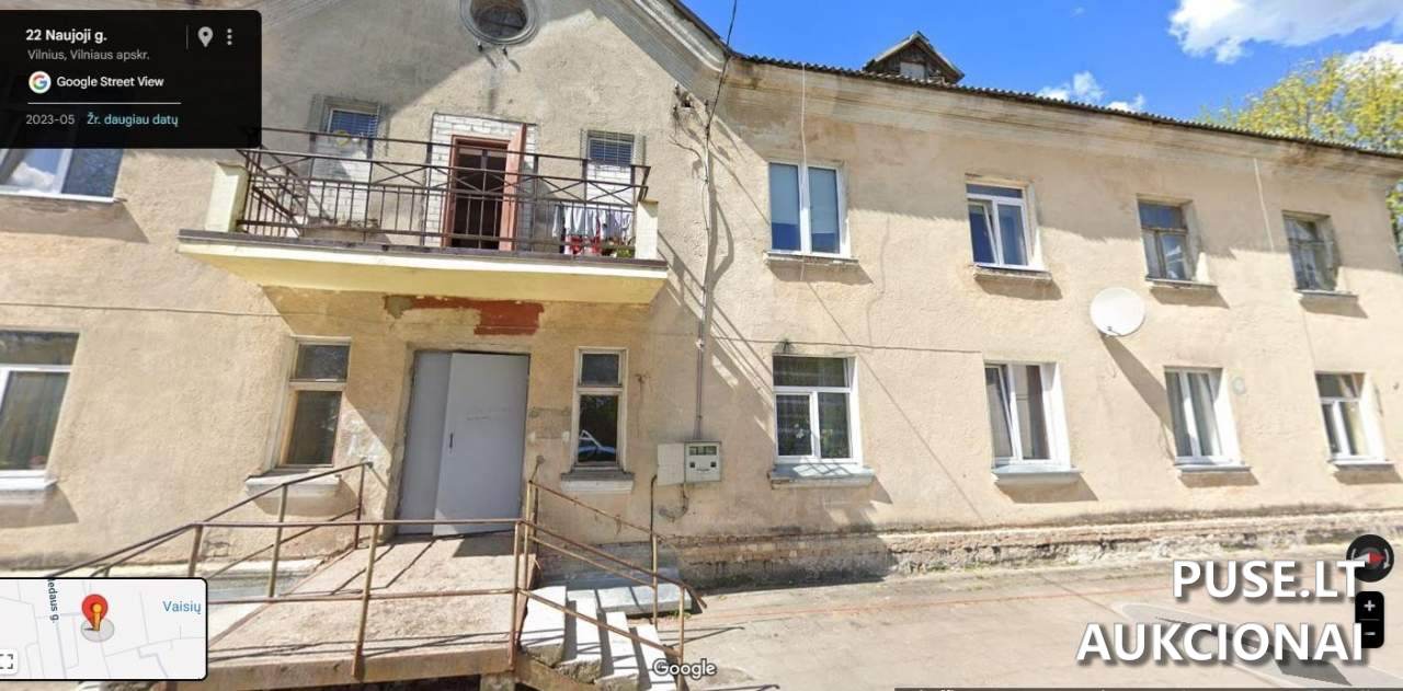 Parduodamas kambarys bendrabutyje Vilniaus m., Naujoji g. 22. Patalpa parduodama kaip atskira dalis (parduodama dalis 1/1). Aprašyme nurodytos ir kitos bendros patalpos: b.n. patalpos pažymėtos 1-14, 1-13, 1-21, 1-3, 1-2, 1-16, 1-15, 1-1, 1-10, 1-8 (8/100 iš 134,64 m2, t.y. 11,18 m2). Pagrindiniai rodikliai: bendras/naudingas/gyvenamasis plotas 17.80 m2, kambarių sk.: 1, aukštas: 1. Pastatas statytas 1960 m., baigtumas 100%. Šildymas: vietinis centrinis; vandentiekis ir nuotekų šalinimas: komunaliniai; dujos: gamtinės; viryklė: dujinė. Pardavimo sąlygos: parduodamas nekilnojamas turtas su nurodytais apribojimais (turto areštas, disponavimo teisės apribojimas). Pradinė kaina aukcione: 24 000 EUR. Unikalus kadastrinis nr.: 1096-0037-8012:0020.